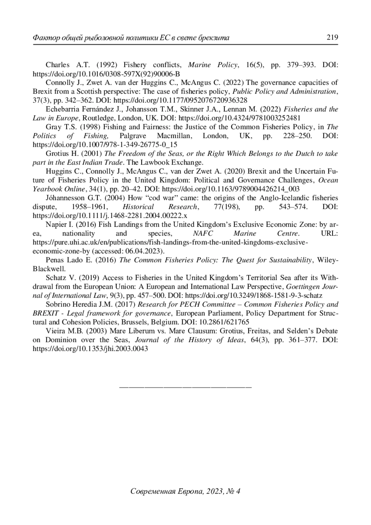 19. Schatz V. (2019) Access to Fisheries in the United Kingdom’s Territorial Sea after its Withdrawal from the European Union: A European and International Law Perspective. Goettingen Journal of International Law. No. 9(3). P. 457-500. DOI: 10.3249/1868-1581-9-3-schatz