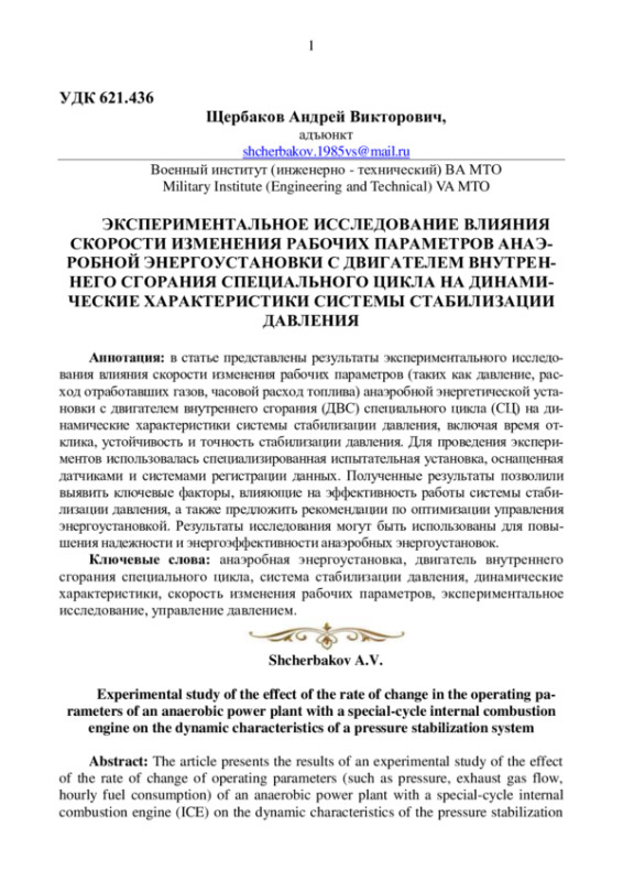 В статье представлены результаты экспериментального исследования влияния скорости изменения рабочих параметров (таких как давление, расход отработавших газов, часовой расход топлива) анаэробной энергетической установки с двигателем внутреннего сгорания (ДВС) специального цикла (СЦ) на динамические характеристики системы стабилизации давления, включая время отклика, устойчивость и точность стабилизации давления. Для проведения экспериментов использовалась специализированная испытательная установка, оснащенная датчиками и системами регистрации данных. Полученные результаты позволили выявить ключевые факторы, влияющие на эффективность работы системы стабилизации давления, а также предложить рекомендации по оптимизации управления энергоустановкой. Результаты исследования могут быть использованы для повышения надежности и энергоэффективности анаэробных энергоустановок.