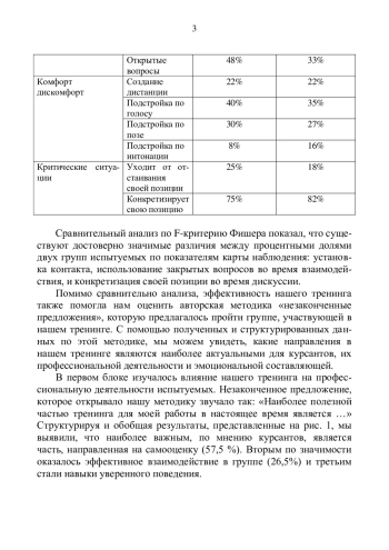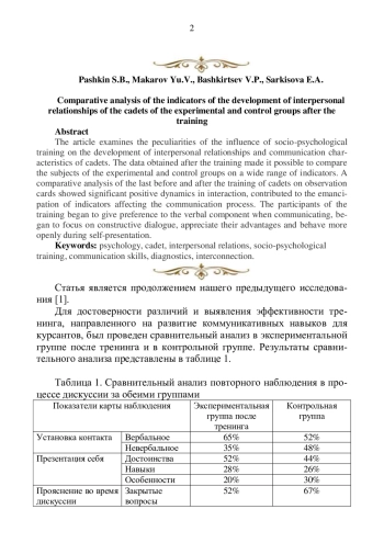 В статье исследованы особенности влияния социально - психологического тренинга на развитие межличностных отношений и коммуникационных характеристик курсантов. Полученные данные после проведения тренинга позволили сравнить испытуемых экспериментальных и контрольных групп по широкому кругу показателей. Сравнительный анализ последних до и после тренинга у курсантов по картам наблюдения показал значительную положительную динамику по взаимодействию, способствовал раскрепощению показателей, влияющих на процесс общения. Участники тренинга стали отдавать при общении предпочтение вербальной составляющей, стали иметь направленность на конструктивное построение диалога, ценить свои достоинства и вести себя более открыто во время самопрезентации.