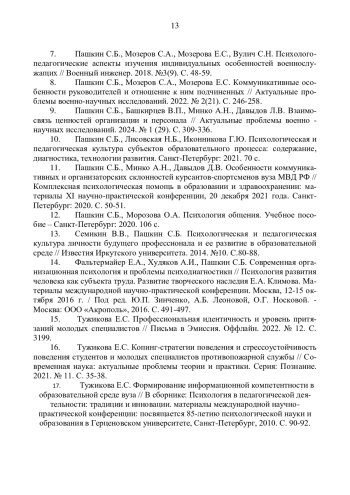 4. Пашкин С.Б., Минко Н.И., Саркисова Е.А. Культура педагогического общения как фактор успешности профессиональной деятельности военного инженера - Санкт-Петербург: 2020. 96 с. EDN: MMNQCD