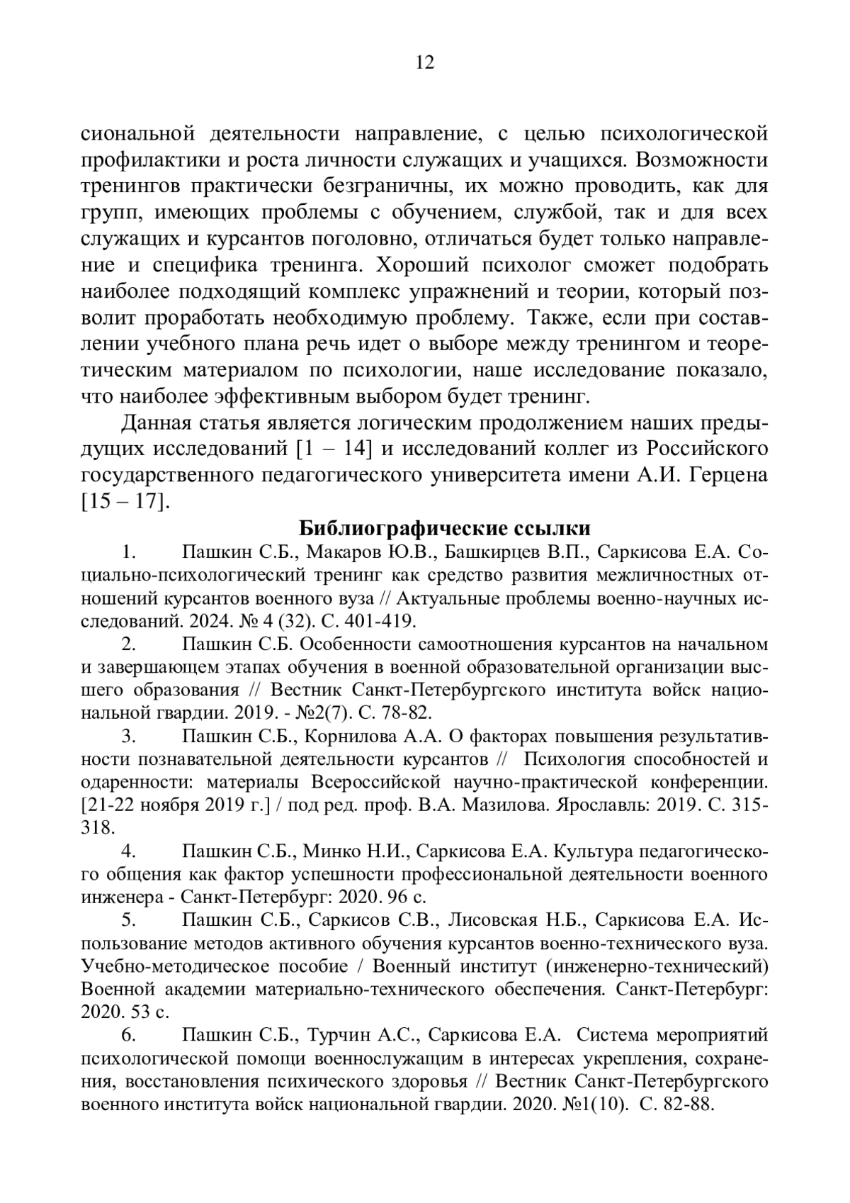 6. Пашкин С.Б., Турчин А.С., Саркисова Е.А. Система мероприятий психологической помощи военнослужащим в интересах укрепления, сохранения, восстановления психического здоровья // Вестник Санкт-Петербургского военного института войск национальной гвардии. 2020. №1(10). С. 82-88. EDN: WNOXWA