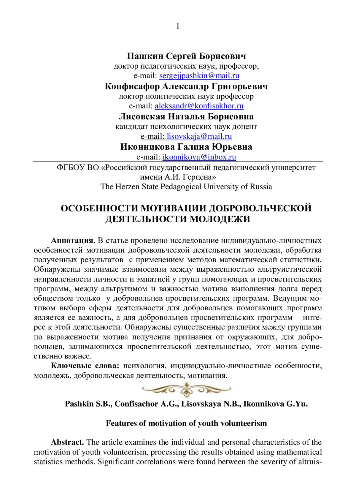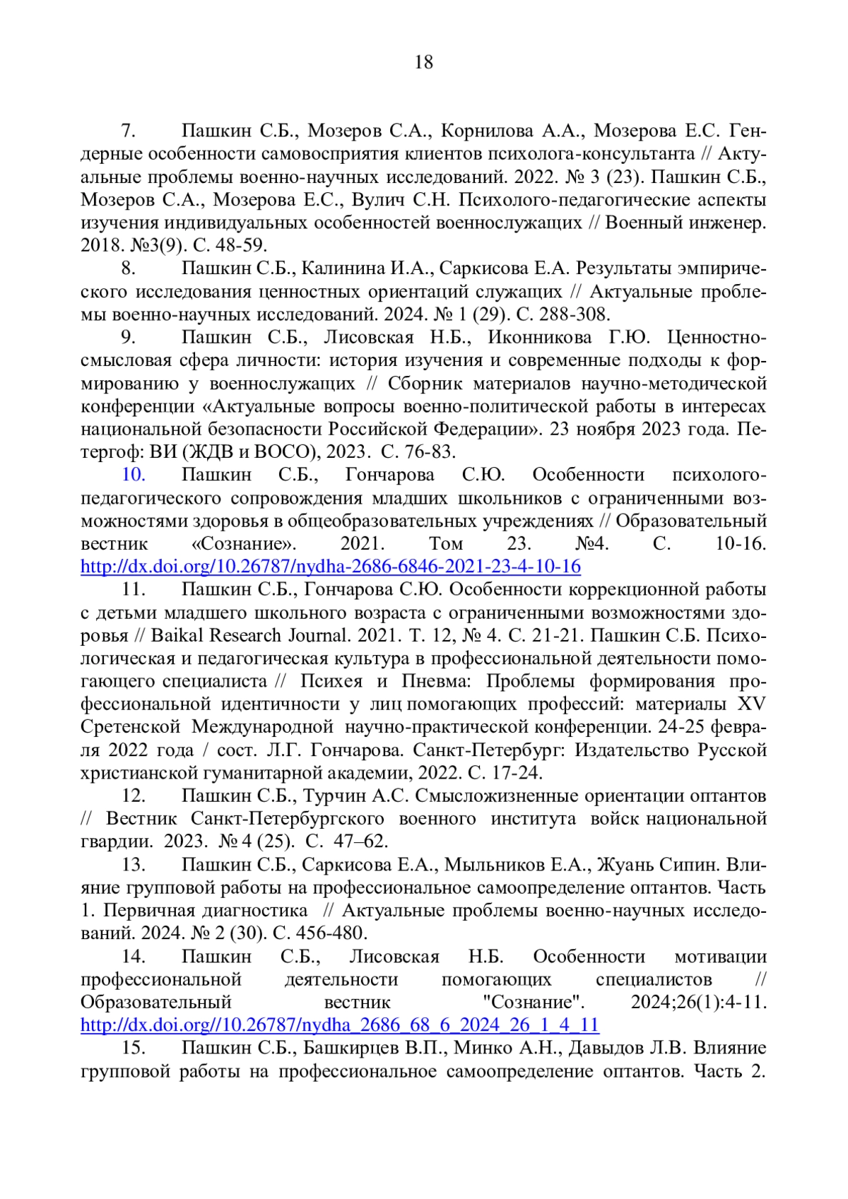 10. Пашкин С.Б., Лисовская Н.Б., Иконникова Г.Ю. Ценностно - смысловая сфера личности: история изучения и современные подходы к формированию у военнослужащих // Сборник материалов научно - методической конференции “Актуальные вопросы военно - политической работы в интересах национальной безопасности Российской Федерации”. 23 ноября 2023 года. Петергоф: 2023. С. 76-83.