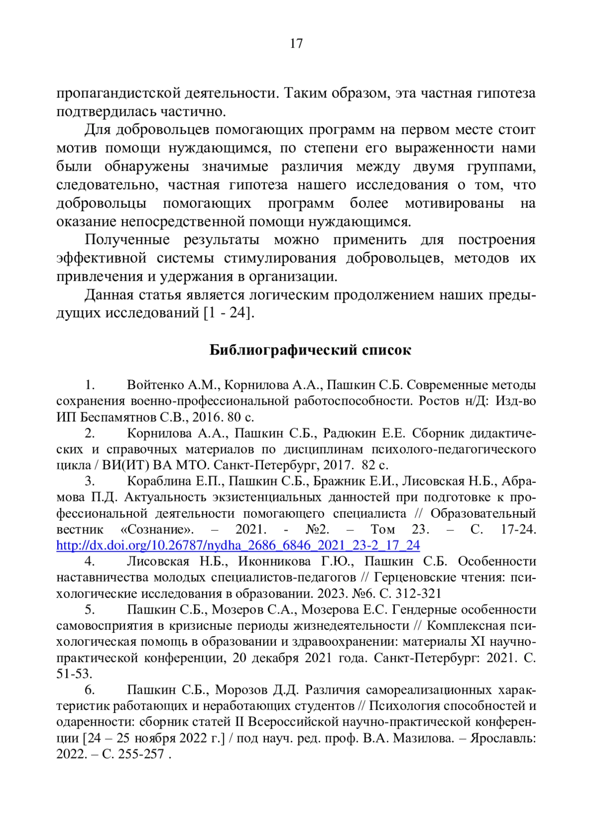3. Кораблина Е.П., Пашкин С.Б., Бражник Е.И., Лисовская Н.Б., Абрамова П.Д. Актуальность экзистенциальных данностей при подготовке к профессиональной деятельности помогающего специалиста / Образовательный вестник “Сознание”. - 2021. - №2. - Том 23. - С. 17-24. DOI: 10.26787/nydha_2686_6846_2021_23-2_17_24 EDN: CDLPBH