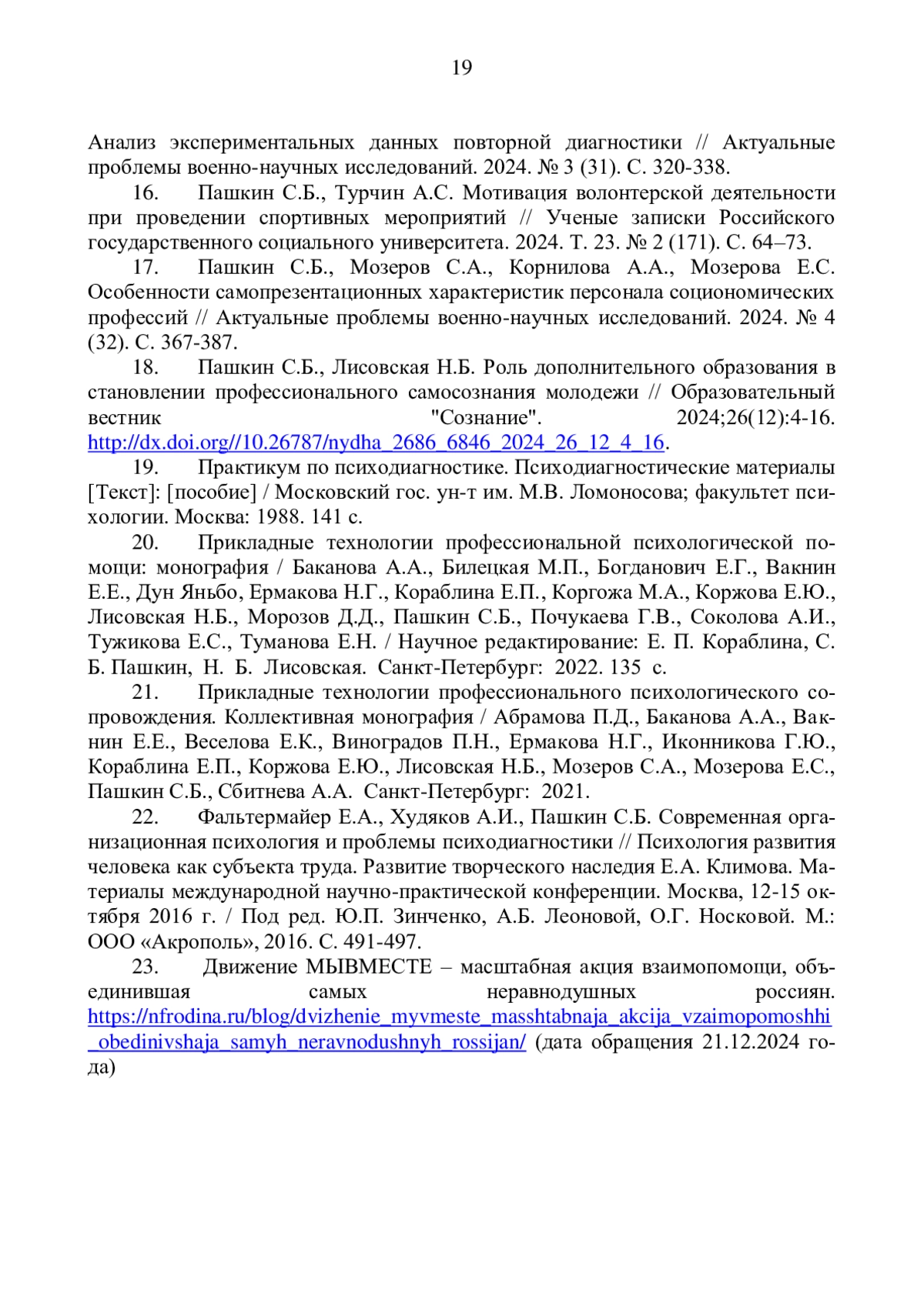 13. Пашкин С.Б. Психологическая и педагогическая культура в профессиональной деятельности помогающего специалиста // Психея и Пневма: Проблемы формирования профессиональной идентичности у лиц помогающих профессий: материалы 15 Сретенской Международной научно - практической конференции. 24-25 февраля 2022 года.