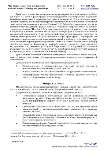 Методология работы включает использование методов теоретического анализа, сравнительного изучения, систематизации научных данных, а также эмпирических методов, таких как анкетирование, интервью, наблюдение и контент-анализ. В процессе исследования выявлены основные факторы, оказывающие влияние на развитие языковой личности, такие как мотивация, уровень коммуникативных навыков, культурная осведомленность, психологическая устойчивость, личностные характеристики и социальный контекст. Особое внимание уделяется концепции вторичной языковой личности, которая формируется в процессе межкультурного взаимодействия и способствует более эффективной коммуникации, межкультурному диалогу и толерантности.