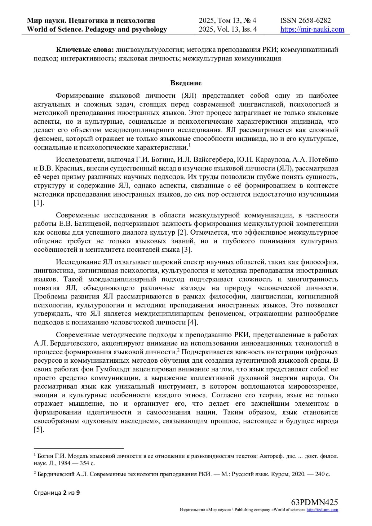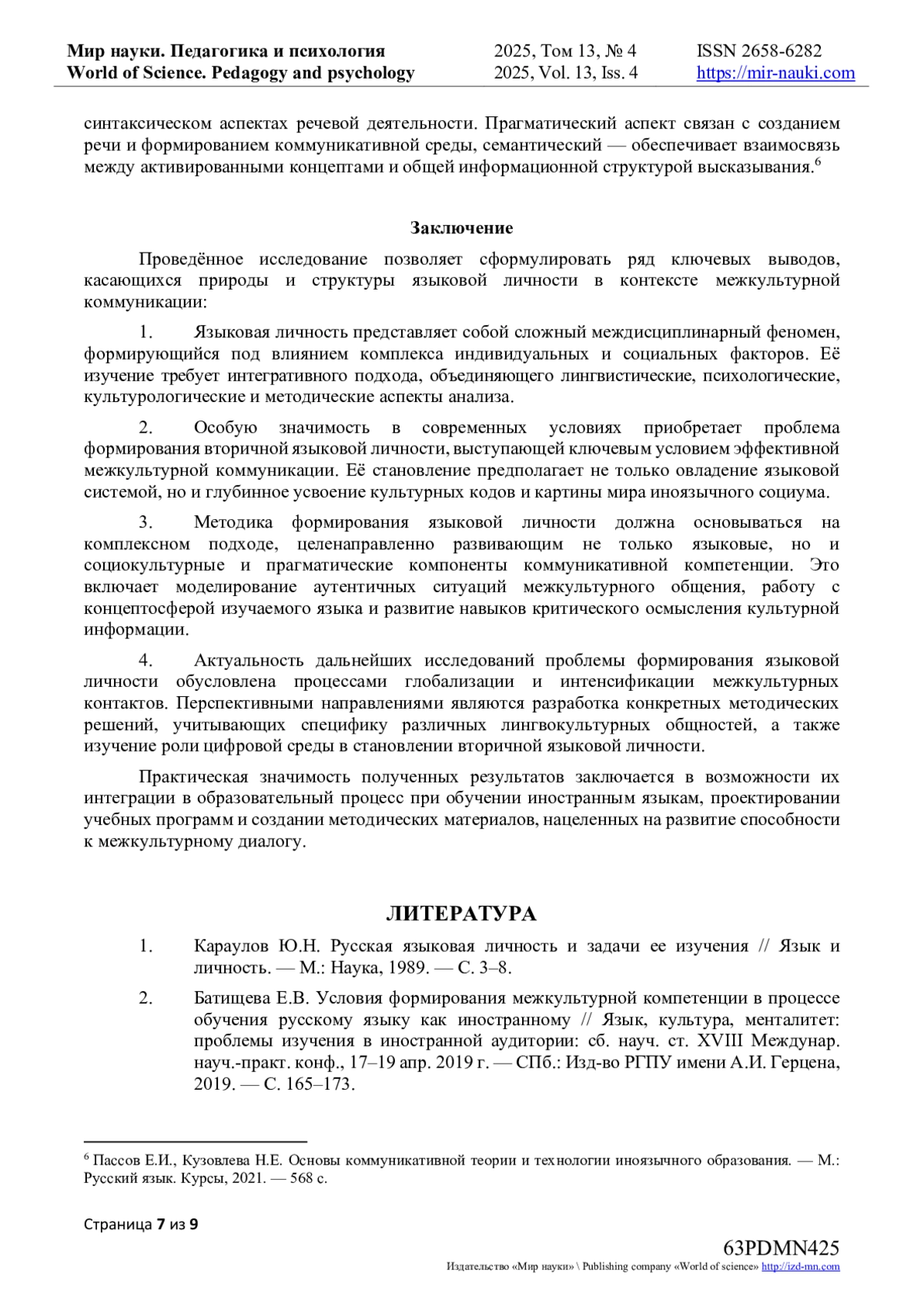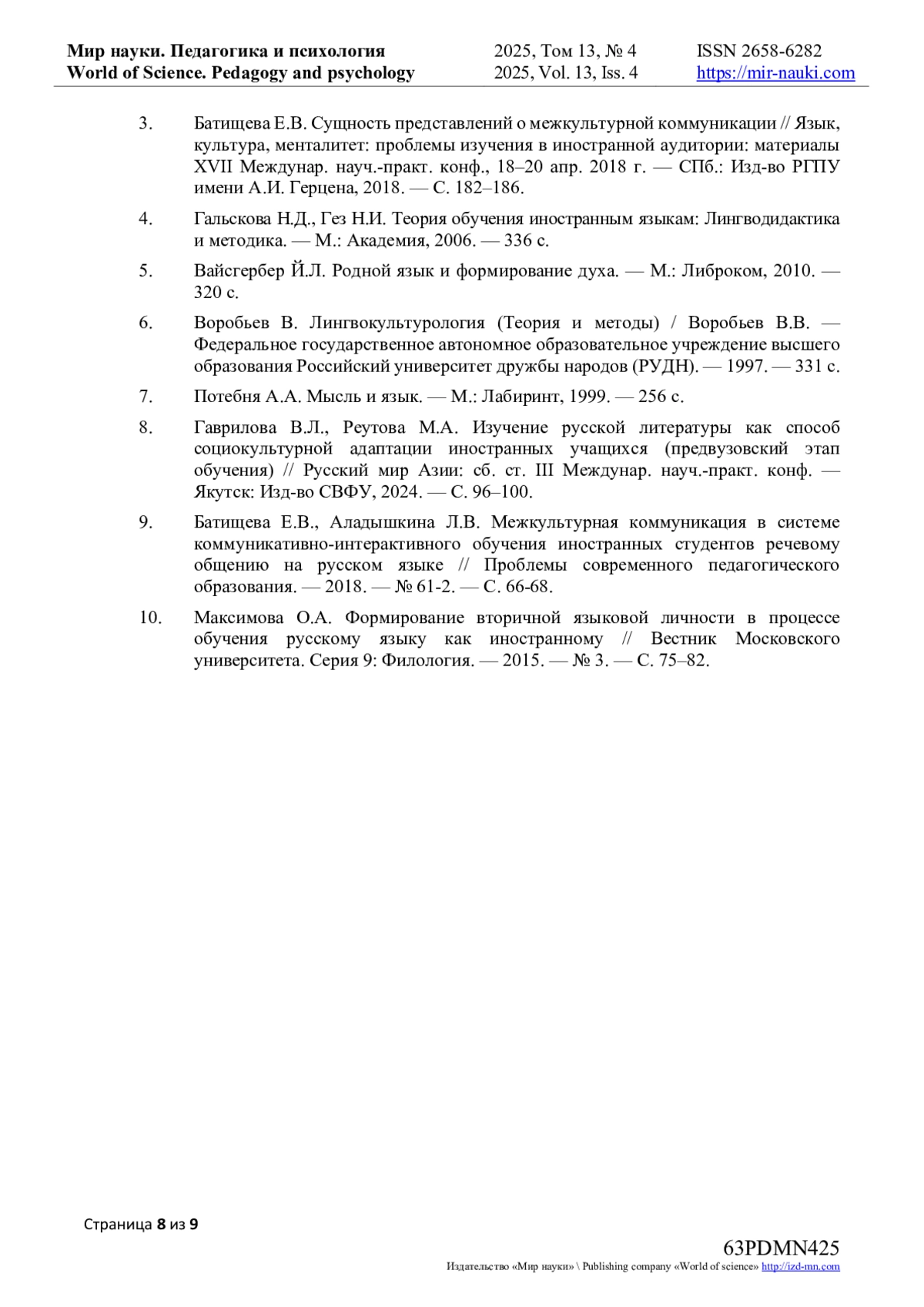 9. Батищева Е.В., Аладышкина Л.В. Межкультурная коммуникация в системе коммуникативно-интерактивного обучения иностранных студентов речевому общению на русском языке // Проблемы современного педагогического образования. - 2018. - № 61-2. - С. 66-68. EDN: VPRRED