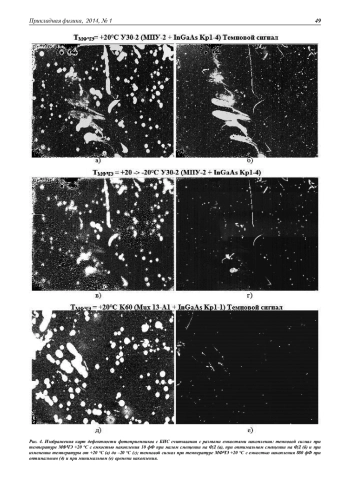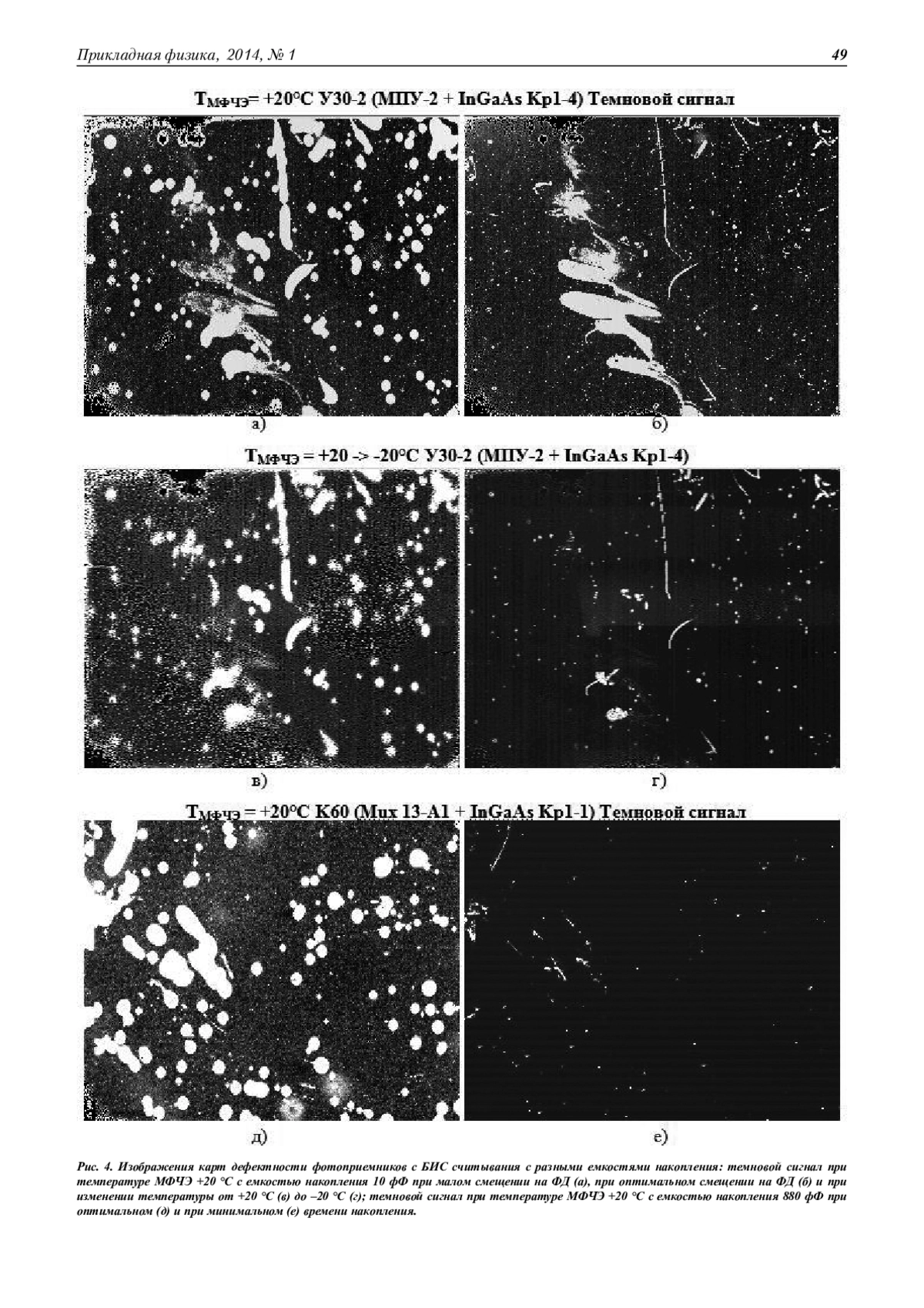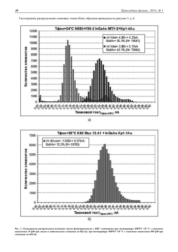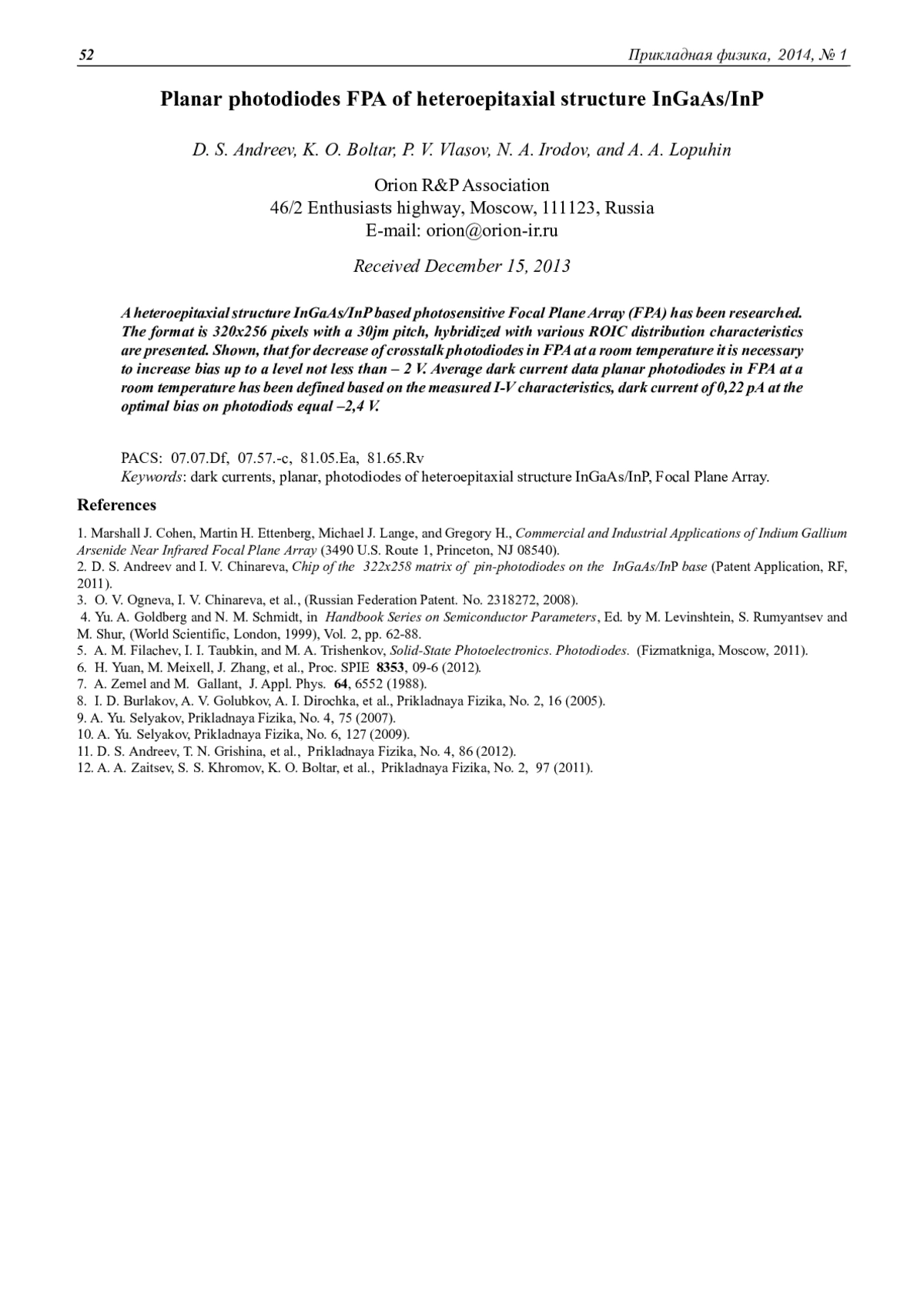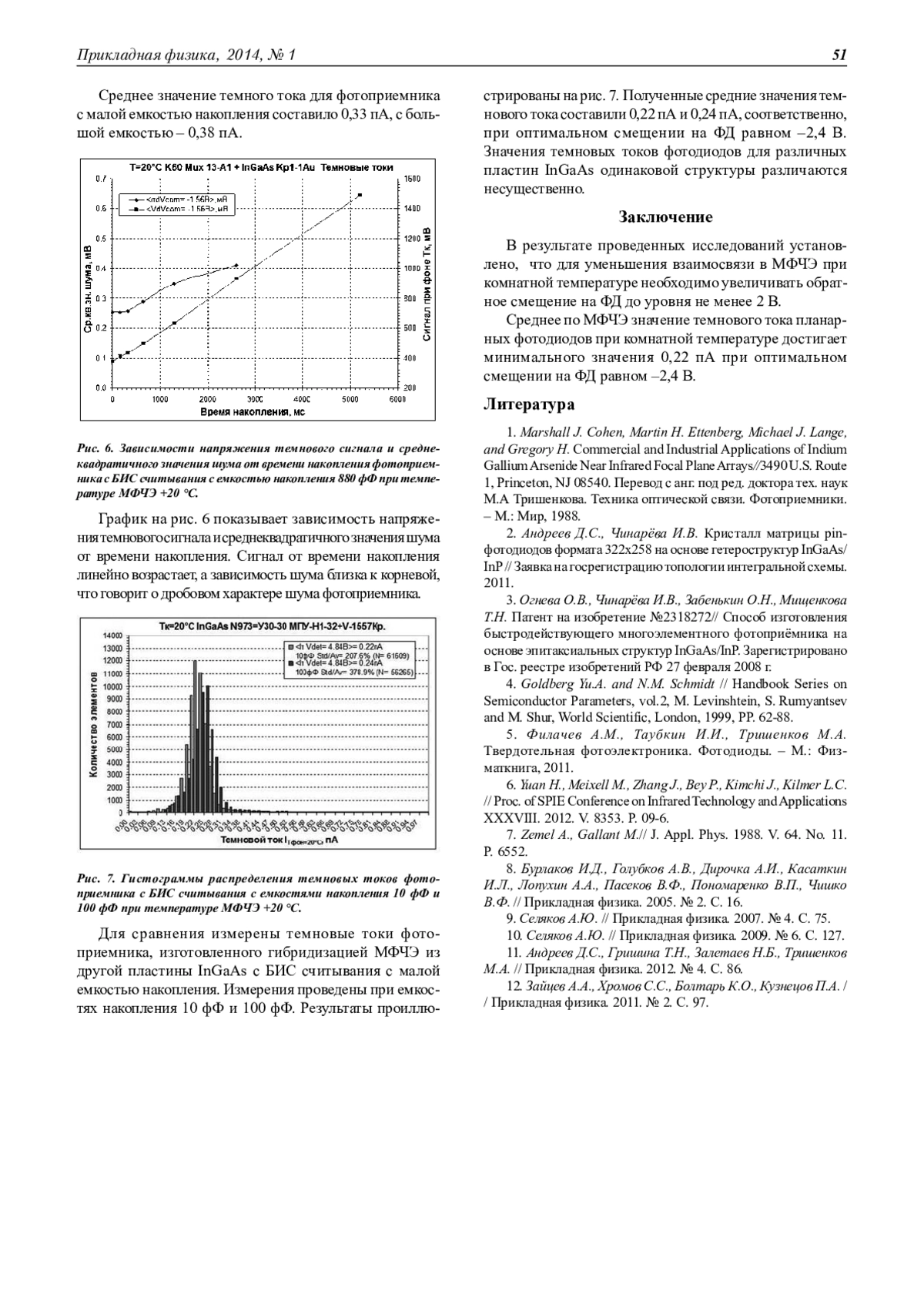 Приведены результаты исследования планарных фотодиодов (ФД) матричных фоточувствительных элементов (МФЧЭ) на основе гетероэпитаксиальной структуры InGaAs/InP формата 320х256 элементов с шагом 30 мкм, гибридизированных с различными типами БИС считывания. Показано, что для уменьшения взаимосвязи МФЧЭ при комнатной температуре необходимо увеличивать обратное смещение на ФД до уровня не менее 2 В. Установлено, что значительного уменьшения темнового тока можно добиться при уменьшении температуры МФЧЭ до -20 °С с помощью двухкаскадного термоэлектрического охладителя. Лучшее среднее по МФЧЭ значение темнового тока планарных фотодиодов при комнатной температуре достигает минимального значения 0,22 пА при оптимальном смещении на ФД равном -2,4 В.