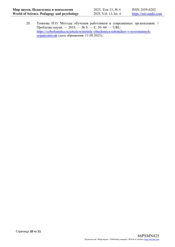 20. Темнова И.О. Методы обучения работников в современных организациях // Проблемы науки. - 2018. - № 9. - С. 50-60. - URL: https://cyberleninka.ru/article/n/metody-obucheniya-rabotnikov-v-sovremennyh-organizatsiyah (дата обращения: 11.08.2025).
