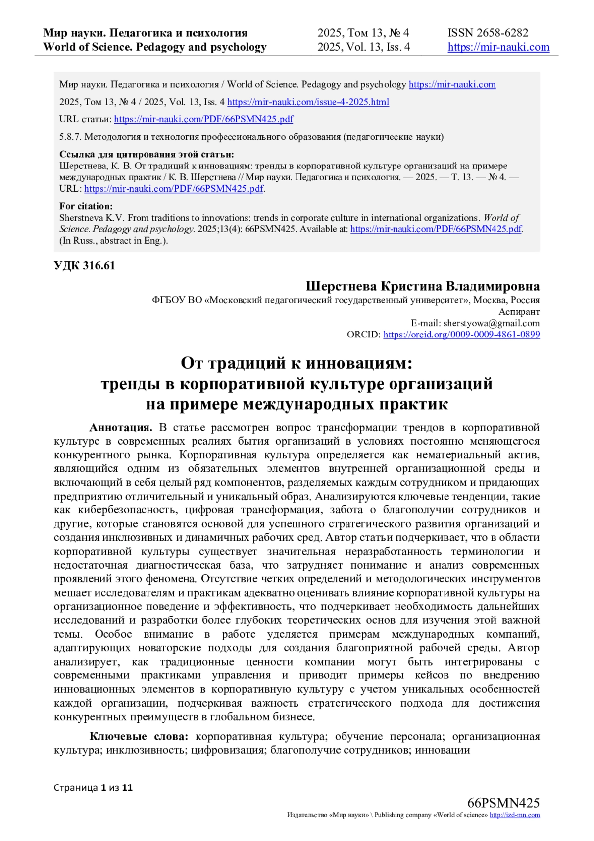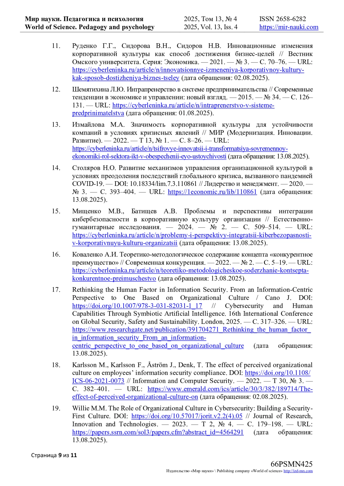 13. Измайлова М.А. Значимость корпоративной культуры для устойчивости компаний в условиях кризисных явлений // МИР (Модернизация. Инновации. Развитие). - 2022. - Т 13, № 1. - С. 8-26. - URL: https://cyberleninka.ru/article/n/tsifrovye-innovatsii-i-transformatsiya-sovremennoy-ekonomiki-rol-sektora-ikt-v-obespechenii-eyo-ustoychivosti (дата обращения: 13.08.2025). EDN: CWTOIS