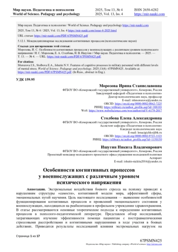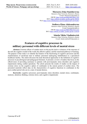 Цель настоящего исследования - выявление особенностей функционирования когнитивных процессов и проявлений эмоционального состояния у военнослужащих, находящихся на реабилитации в профильном учреждении здравоохранения. В статье рассматриваются основные теоретические подходы к определению когнитивных процессов в психолого-педагогической литературе. Представлен обзор исследований, затрагивающих изучение эффективности помощи пациентам с посттравматическими стрессовыми расстройствами и когнитивными нарушениями в ходе участия в боевых действиях. Приводятся результаты исследований влияния экстремальных нагрузок на когнитивную сферу комбатантов в отдаленном периоде боевого стресса. В представленных материалах отражены данные о характеристиках когнитивных функций у комбатантов в послебоевом периоде, находящихся в состоянии психического напряжения. Нарушения когнитивных функций у комбатантов носят избирательный характер, затрагивают преимущественно внимание, оперативную память, психическую устойчивость, эмоциональную сферу и лобные регуляторные процессы. Эмоциональная сфера характеризуется высокими показателями тревожности и депрессии.