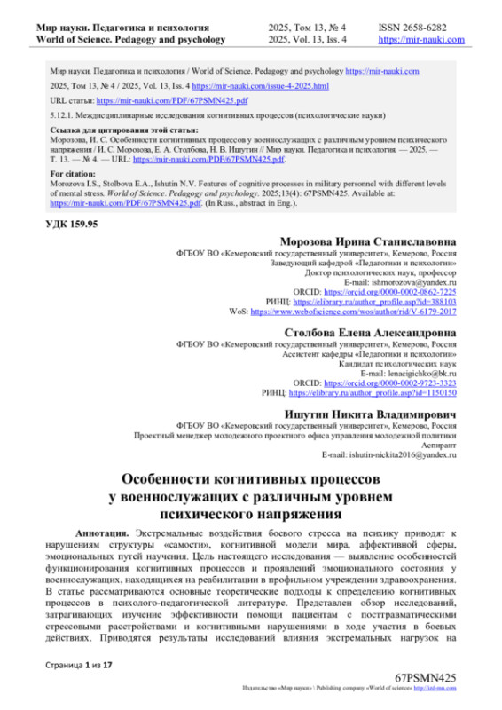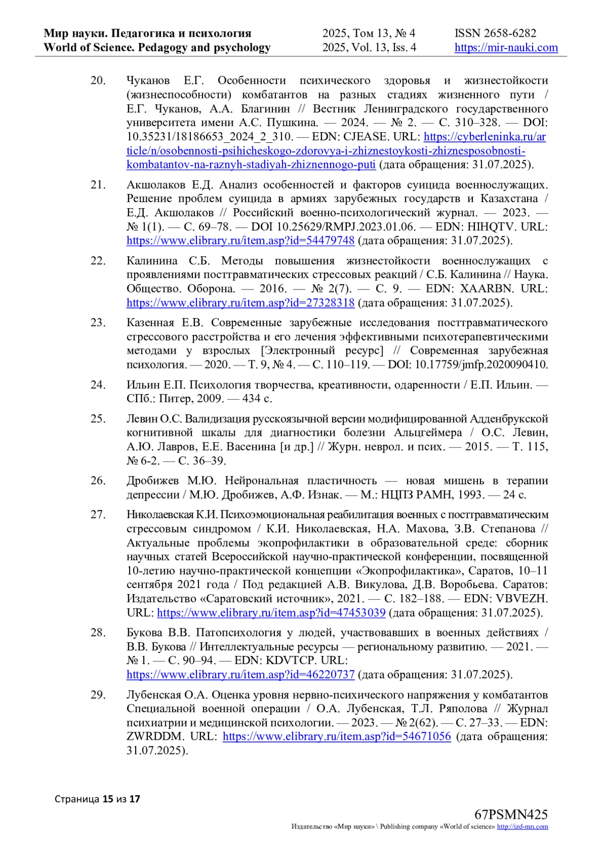 29. Лубенская О.А. Оценка уровня нервно-психического напряжения у комбатантов Специальной военной операции / О.А. Лубенская, Т.Л. Ряполова // Журнал психиатрии и медицинской психологии. - 2023. - № 2(62). - С. 27-33. - URL: item.asp?id=54671056 (дата обращения: 31.07.2025). EDN: ZWRDDM