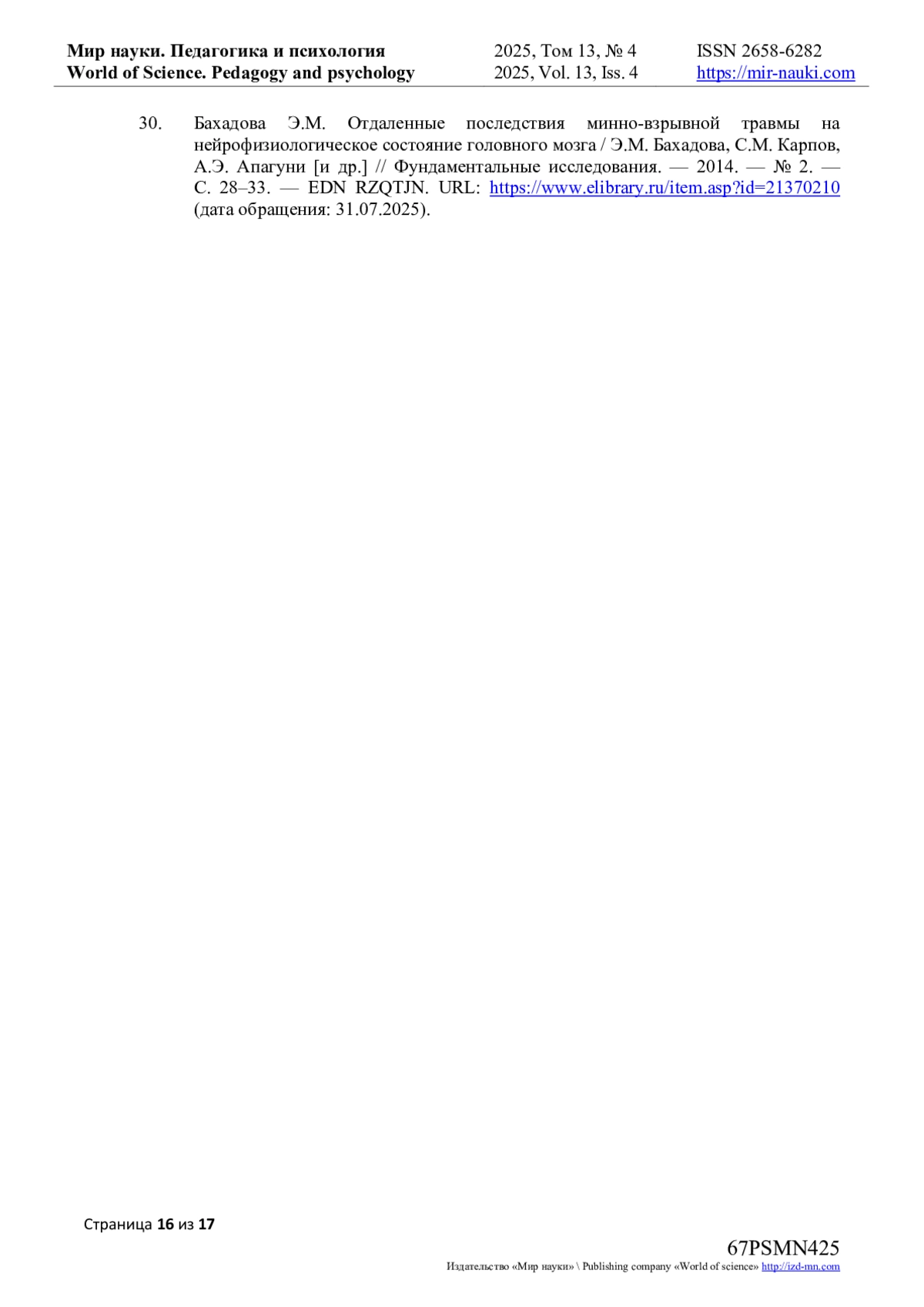30. Бахадова Э.М. Отдаленные последствия минно-взрывной травмы на нейрофизиологическое состояние головного мозга / Э.М. Бахадова, С.М. Карпов, А.Э. Апагуни [и др.] // Фундаментальные исследования. - 2014. - № 2. - С. 28-33. URL: item.asp?id=21370210 (дата обращения: 31.07.2025). EDN: RZQTJN