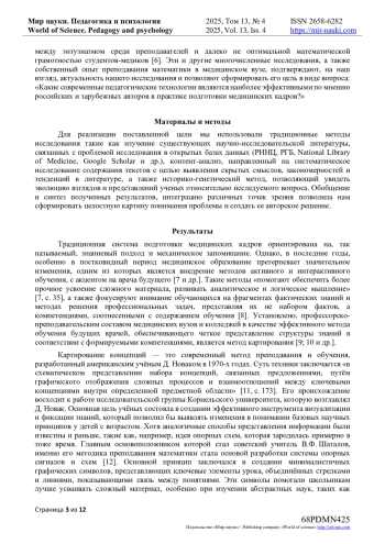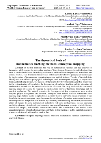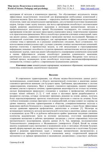 Цель исследования - определить наиболее эффективные педагогические технологии, такие как концептуальное картирование, для улучшения подготовки медицинских кадров. Авторы ставят задачу показать, как метод картирования способствует систематизации знаний, развитию аналитического мышления и интеграции математических методов в профессиональную деятельность врачей. Исследование подтвердило, что концептуальное картирование позволяет наглядно представлять взаимосвязи между теоретическими знаниями и их практическим применением. Метод способствует развитию ключевых компетенций, таких как анализ данных, управление проектами и проведение научных исследований. Примеры из медицинской статистики демонстрируют, как картирование помогает студентам осваивать сложные темы и применять их в реальных клинических ситуациях. Было установлено, что использование концептуальных карт: улучшает усвоение сложных математических концепций, включая статистику и вероятностные модели, за счёт визуализации и структурирования информации; повышает способность студентов применять математические методы в реальных медицинских задачах, таких как анализ заболеваемости, планирование клинических испытаний и оценка эффективности лечения; способствует развитию клинического мышления, критического анализа данных и навыков научной коммуникации. Внедрение этого метода в учебный процесс медицинских вузов способствует подготовке высококвалифицированных специалистов, готовых к работе с современными медицинскими данными.