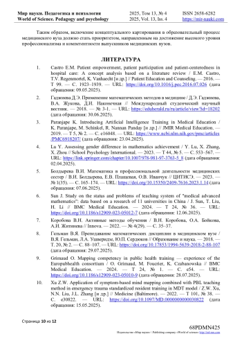 6. Sun J. Study on the status and problems of teaching system of “medical advanced mathematics”: data based on a research of 11 universities in China / J. Sun, T. Liu, H. Li // BMC Medical Education. - 2024. - Т 24, № 36. - 10.1186/s12909-023-05012-7 (дата обращения: 12.06.2025). DOI: 10.1186/s12909-023-05012-7(