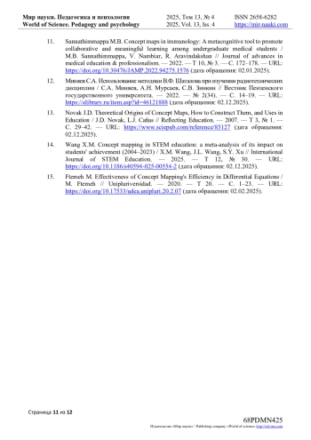 14. Wang X.M. Concept mapping in STEM education: a meta-analysis of its impact on students’ achievement (2004-2023) / X.M. Wang, J.L. Wang, S.Y. Xu // International Journal of STEM Education. - 2025. - Т 12, № 30. - 10.1186/s40594-025-00554-2 (дата обращения: 02.12.2025). DOI: 10.1186/s40594-025-00554-2(