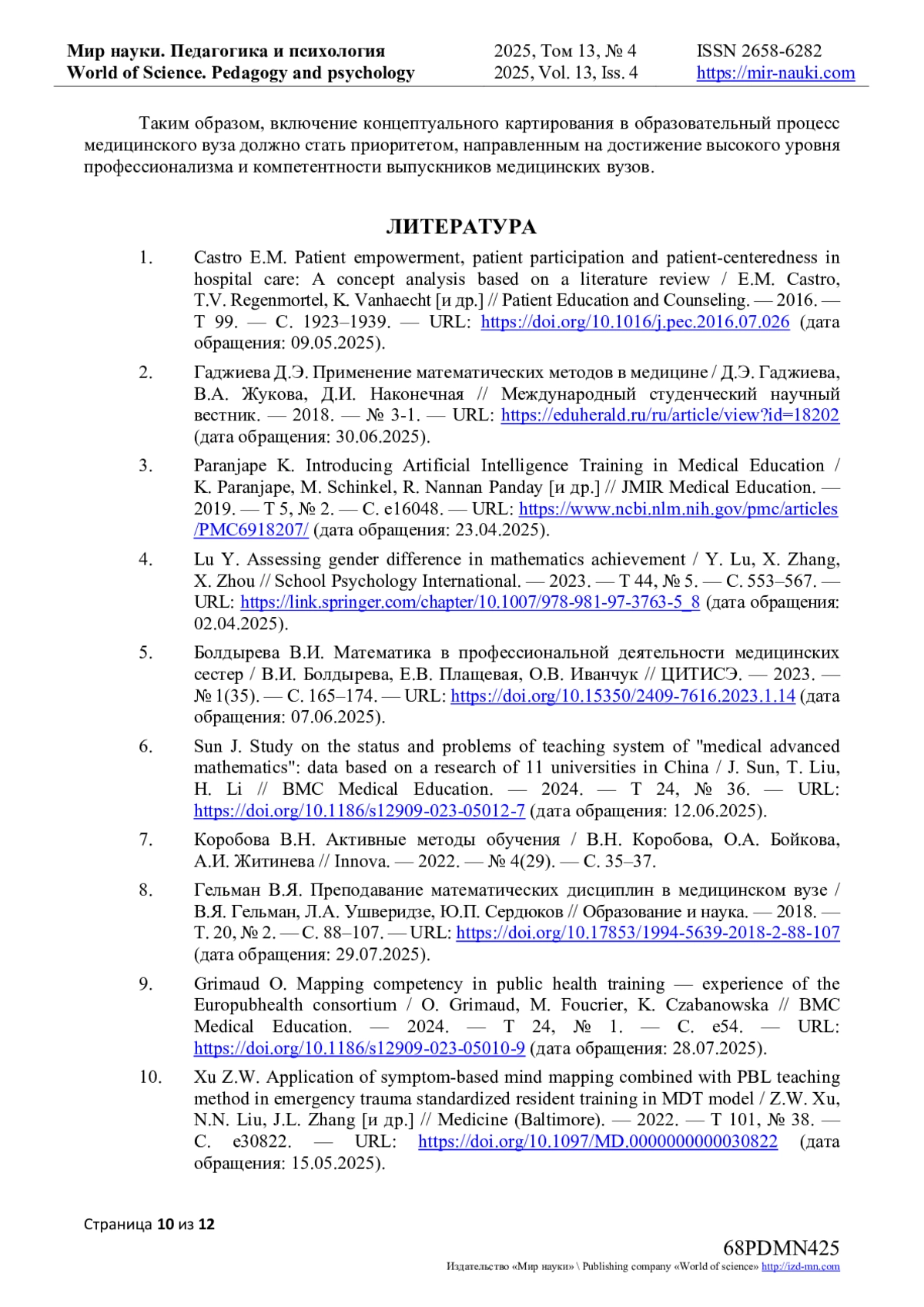 10. Xu Z.W. Application of symptom-based mind mapping combined with PBL teaching method in emergency trauma standardized resident training in MDT model / Z.W. Xu, N.N. Liu, J.L. Zhang [и др.] // Medicine (Baltimore). - 2022. - Т 101, № 38. - С. e30822. - 10.1097/MD.0000000000030822 (дата обращения: 15.05.2025). DOI: 10.1097/MD.0000000000030822( EDN: YWONGJ