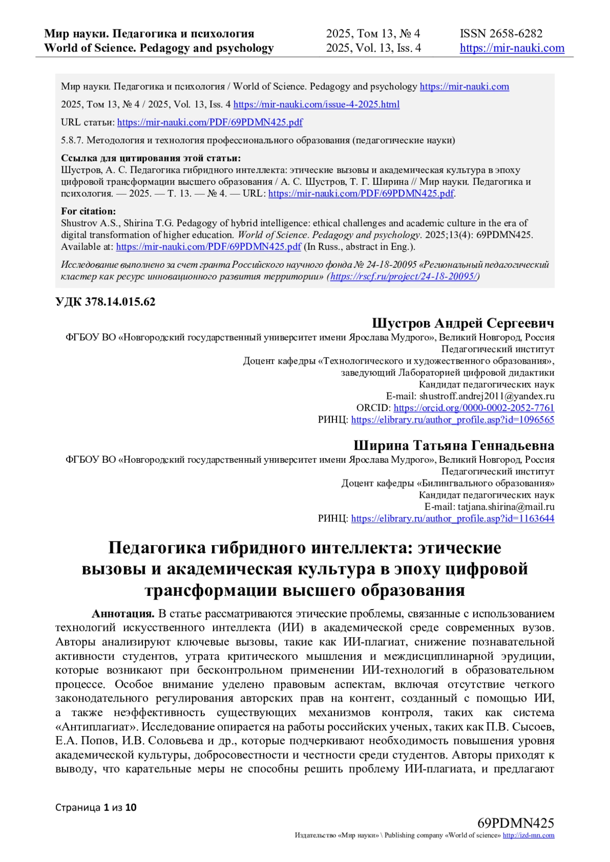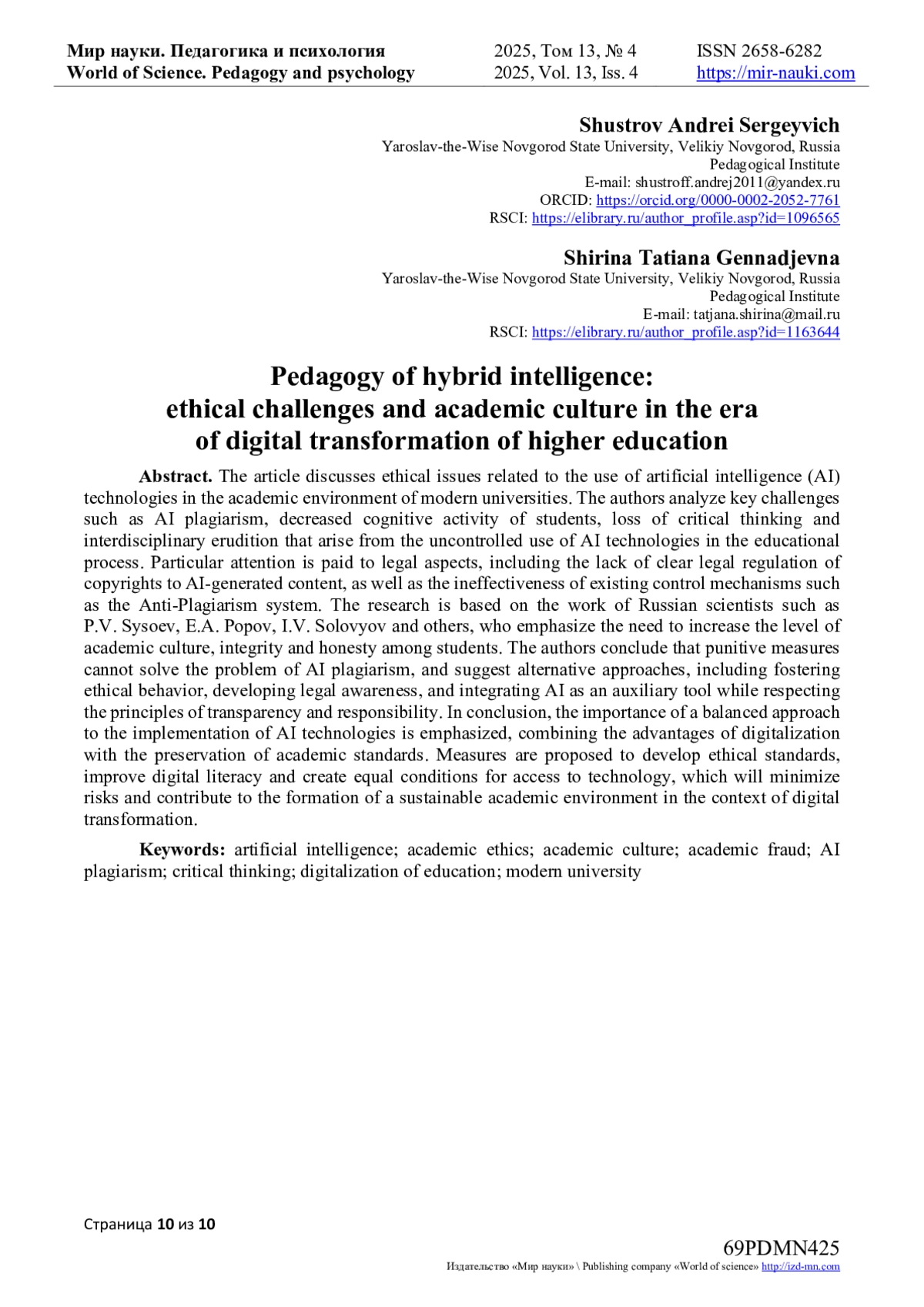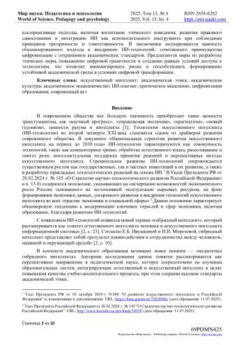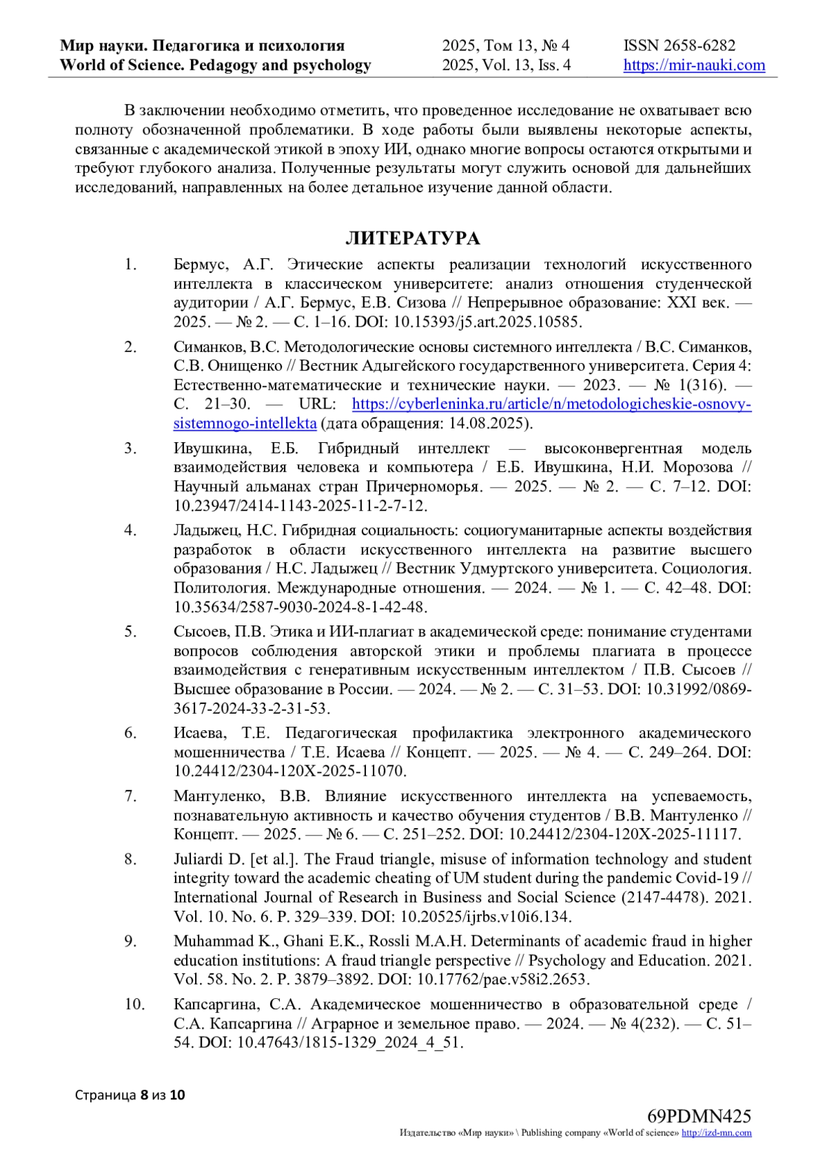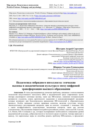 1. Бермус, А.Г. Этические аспекты реализации технологий искусственного интеллекта в классическом университете: анализ отношения студенческой аудитории / А.Г. Бермус, Е.В. Сизова // Непрерывное образование: XXI век. - 2025. - № 2. - С. 1-16. DOI: 10.15393/j5.art.2025.10585 EDN: BQHTHY
