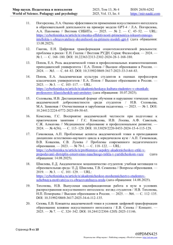 20. Сизова, Е.В. Концепты академической этики в условиях цифровой трансформации образования: влияние искусственного интеллекта / Е.В. Сизова // Концепт. - 2025. - № 7. - С. 324-342. DOI: 10.24412/2304-120X-2025-11146