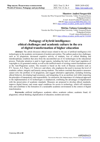 В статье рассматриваются этические проблемы, связанные с использованием технологий искусственного интеллекта (ИИ) в академической среде современных вузов. Авторы анализируют ключевые вызовы, такие как ИИ-плагиат, снижение познавательной активности студентов, утрата критического мышления и междисциплинарной эрудиции, которые возникают при бесконтрольном применении ИИ-технологий в образовательном процессе. Особое внимание уделено правовым аспектам, включая отсутствие четкого законодательного регулирования авторских прав на контент, созданный с помощью ИИ, а также неэффективность существующих механизмов контроля, таких как система «Антиплагиат». Исследование опирается на работы российских ученых, таких как П. В. Сысоев, Е. А. Попов, И. В. Соловьева и др., которые подчеркивают необходимость повышения уровня академической культуры, добросовестности и честности среди студентов. Авторы приходят к выводу, что карательные меры не способны решить проблему ИИ-плагиата, и предлагают альтернативные подходы, включая воспитание этического поведения, развитие правового самосознания и интеграцию ИИ как вспомогательного инструмента при соблюдении принципов прозрачности и ответственности. В заключении подчеркивается важность сбалансированного подхода к внедрению ИИ-технологий, сочетающего преимущества цифровизации с сохранением академических стандартов. Предлагаются меры по разработке этических норм, повышению цифровой грамотности и созданию равных условий доступа к технологиям, что позволит минимизировать риски и способствовать формированию устойчивой академической среды в условиях цифровой трансформации.