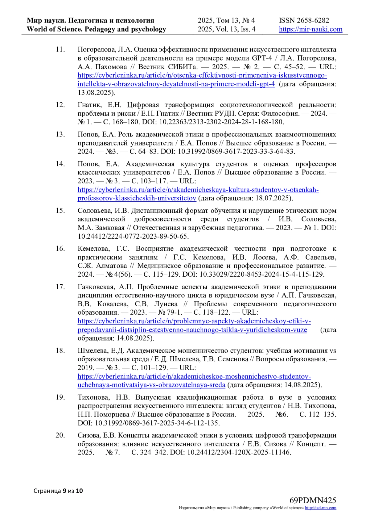 18. Шмелева, Е.Д. Академическое мошенничество студентов: учебная мотивация vs образовательная среда / Е.Д. Шмелева, Т.В. Семенова // Вопросы образования. - 2019. - № 3. - С. 101-129. - URL: https://cyberleninka.ru/article/n/akademicheskoe-moshennichestvo-studentov-uchebnaya-motivatsiya-vs-obrazovatelnaya-sreda (дата обращения: 14.08.2025).