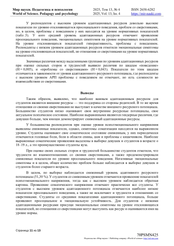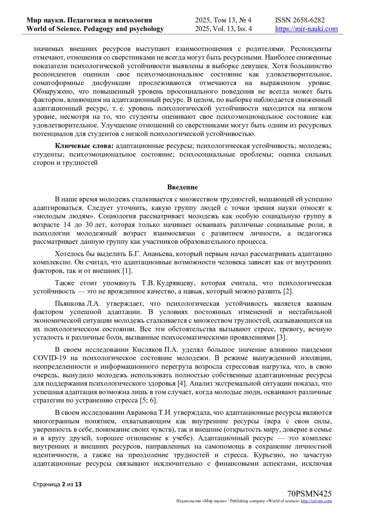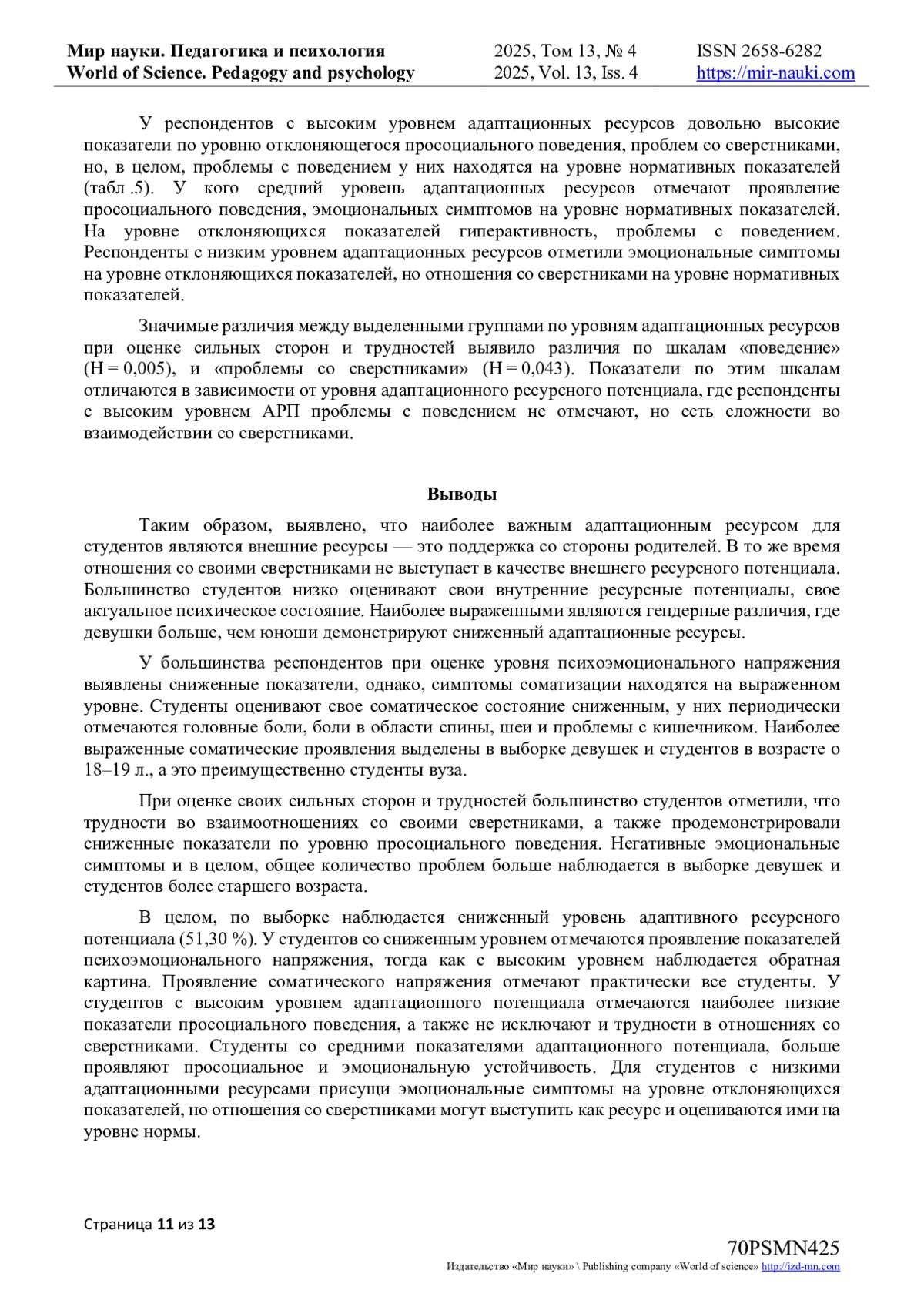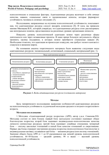 В статье рассмотрены особенности адаптационного ресурса, психоэмоционального состояния и уровня психологической устойчивости у студентов. Авторами рассмотрены теоретические основы понятия адаптационный ресурс и его влияние на психологическую устойчивость личности. Теоретический анализ позволил выделить виды адаптационных ресурсов: эмоциональный, когнитивный, социальный и материальный. Проведено эмпирическое исследование среди студентов в возрасте от 15-19 лет: оценка психоэмоционального состояния (1), выявление психосоциальных и эмоциональных проблем (2), определение внешних, внутренних адаптационных ресурсов и уровня психологической устойчивости (3). Полученные результаты рассмотрены в зависимости от возрастных и гендерных различий и уровня психологической устойчивости. Эмпирически проверена гипотеза о том, что адаптационный ресурс будет отличаться в зависимости от возраста, гендера, а также у студентов с разным уровнем психологической устойчивости будут различные показатели оценки психоэмоционального состояния. Выявлено, что основным адаптационным ресурсом для студентов являются внешние, чем свои внутренние. В качестве наиболее значимых внешних ресурсов выступают взаимоотношения с родителями. Респонденты отмечают, отношения со сверстниками не всегда могут быть ресурсными. Наиболее сниженные показатели психологической устойчивости выявлены в выборке девушек. Хотя большинство респондентов оценили свое психоэмоциональное состояние как удовлетворительное, соматоформные дисфункции прослеживаются отмечаются на выраженном уровне. Обнаружено, что повышенный уровень просоциального поведения не всегда может быть фактором, влияющим на адаптационный ресурс. В целом, по выборке наблюдается сниженный адаптационный ресурс, т. е. уровень психологической устойчивости находится на низком уровне, несмотря на то, что студенты оценивают свое психоэмоциональное состояние как удовлетворительное. Улучшение отношений со сверстниками могут быть одним из ресурсных потенциалов для студентов с низкой психологической устойчивостью.