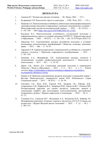 7. Гриднева А.А., Мещерякова Э.И. Адаптационные ресурсы личности в экстремальных условиях профессиональной деятельности // Психология и психотехника. - 2017. - № 1. - С. 85-95.
