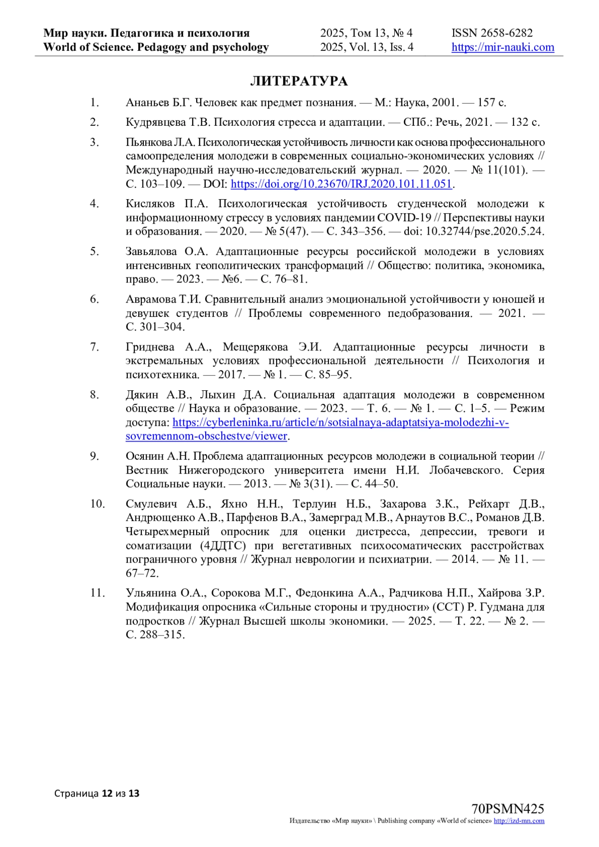 4. Кисляков П.А. Психологическая устойчивость студенческой молодежи к информационному стрессу в условиях пандемии COVID-19 // Перспективы науки и образования. - 2020. - № 5(47). - С. 343-356. -. DOI: 10.32744/pse.2020.5.24 EDN: CDFBTR