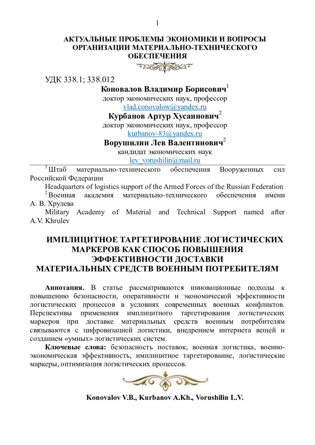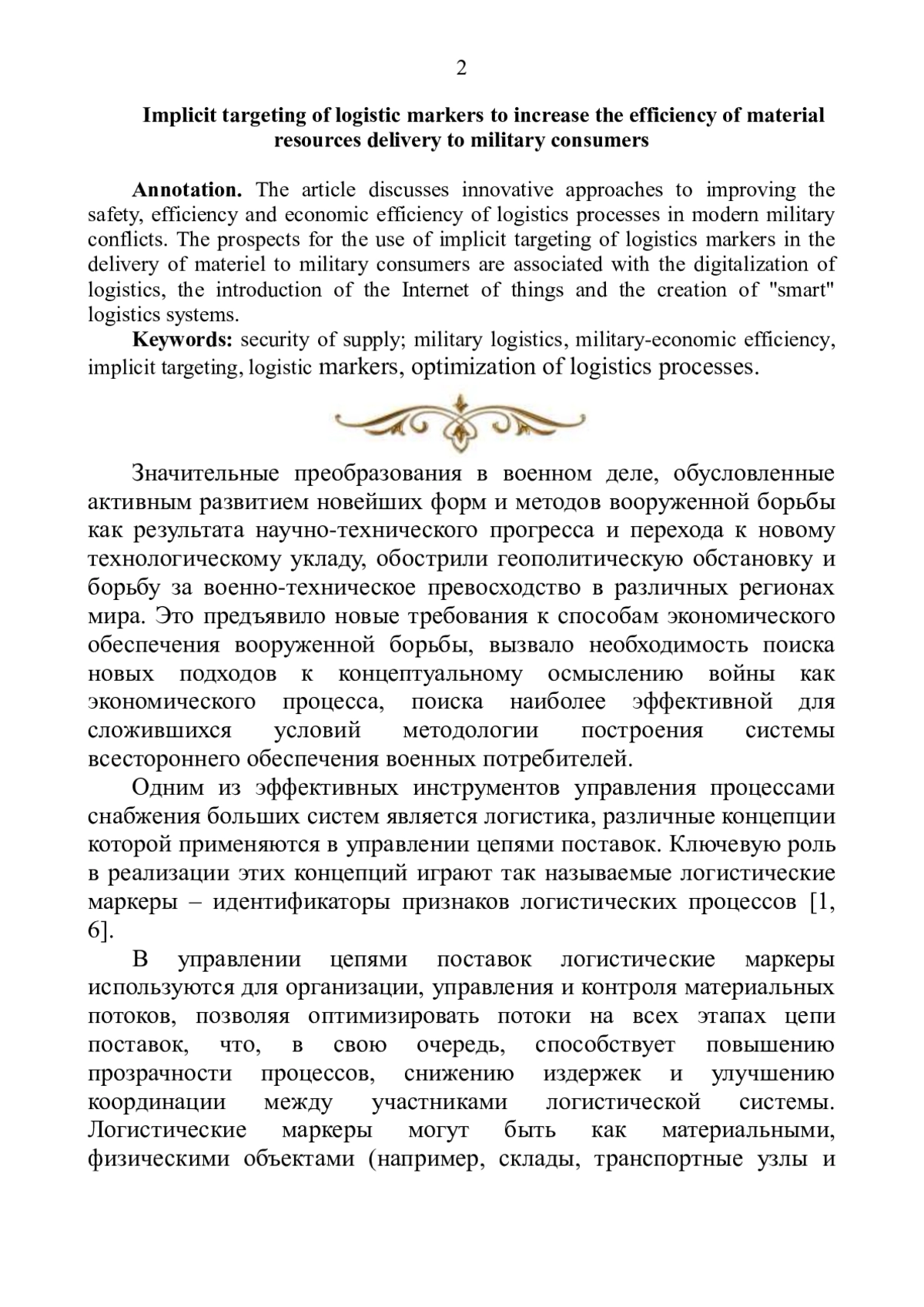 В статье рассматриваются инновационные подходы к повышению безопасности, оперативности и экономической эффективности логистических процессов в условиях современных военных конфликтов. Перспективы применения имплицитного таргетирования логистических маркеров при доставке материальных средств военным потребителям связываются с цифровизацией логистики, внедрением интернета вещей и созданием «умных» логистических систем.