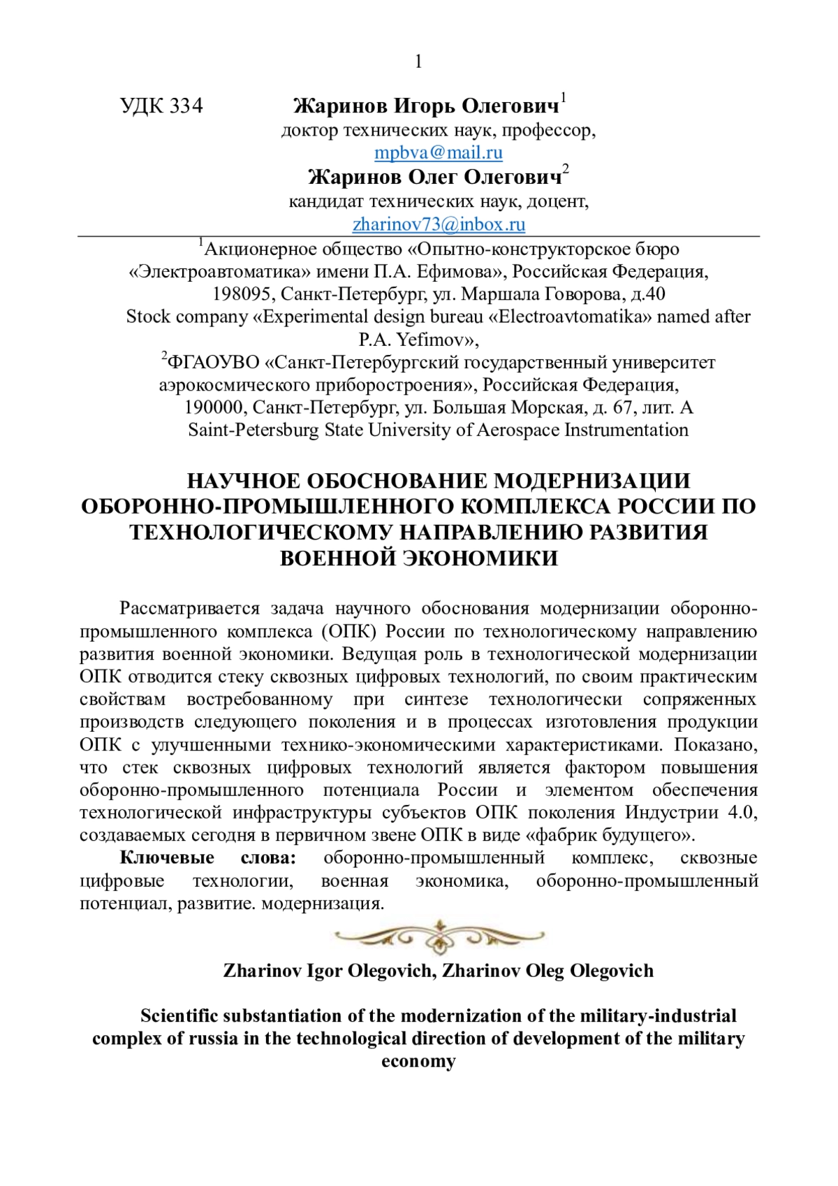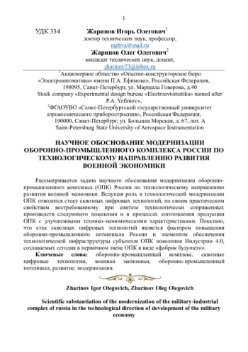 8. Жаринов И.О. Экономическая стратегия управляемой трансформации оборонно - промышленного комплекса на основе динамики суверенного стека сквозных цифровых технологий // Вооружение и экономика. 2023. № 4(66).