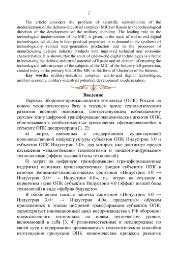 Переход оборонно-промышленного комплекса (ОПК) России на новую технологическую базу в текущем цикле технологического развития военной экономики, соответствующем наблюдаемому сегодня этапу цифровой трансформации экономических агентов ОПК, обосновывается необходимостью преодоления сформировавшейся в сегменте ОПК диспропорции [1, 2]: