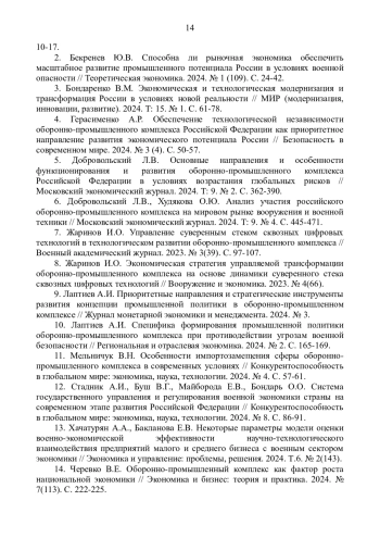 5. Добровольский Л.В. Основные направления и особенности функционирования и развития оборонно - промышленного комплекса Российской Федерации в условиях возрастания глобальных рисков // Московский экономический журнал. 2024. Т: 9. № 2. С. 362-390. EDN: FVKLVK