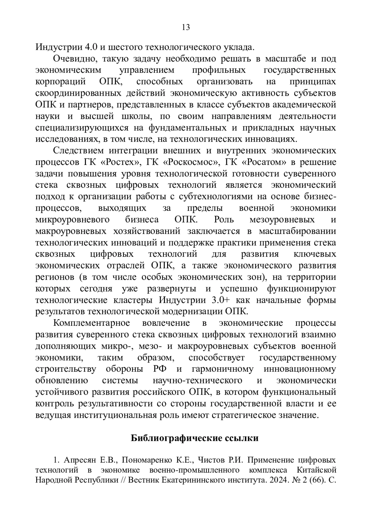 1. Апресян Е.В., Пономаренко К.Е., Чистов Р.И. Применение цифровых технологий в экономике военно - промышленного комплекса Китайской Народной Республики // Вестник Екатерининского института. 2024. № 2 (66). С. 10-17. EDN: PWCWGK