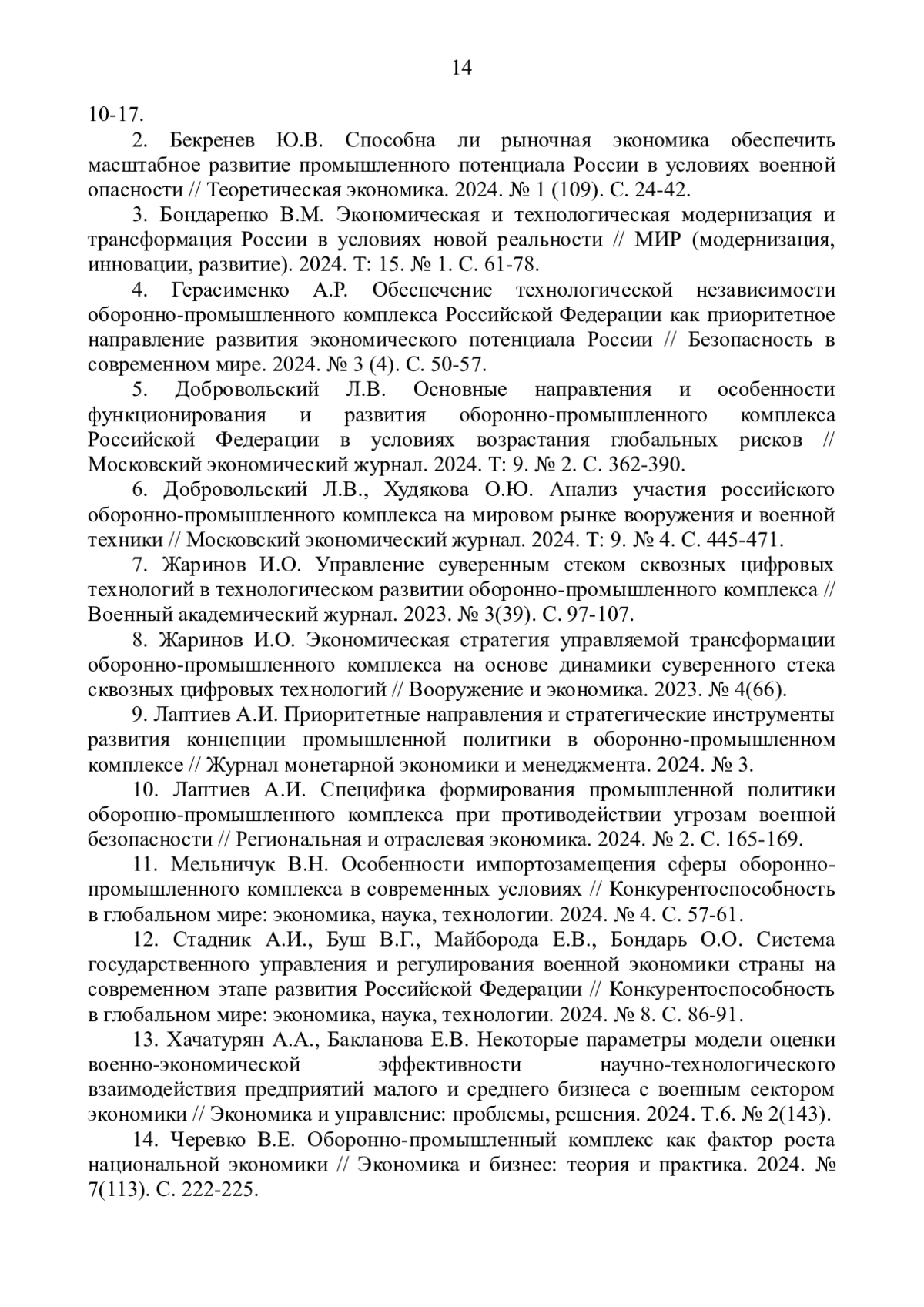 2. Бекренев Ю.В. Способна ли рыночная экономика обеспечить масштабное развитие промышленного потенциала России в условиях военной опасности // Теоретическая экономика. 2024. № 1 (109). С. 24-42.