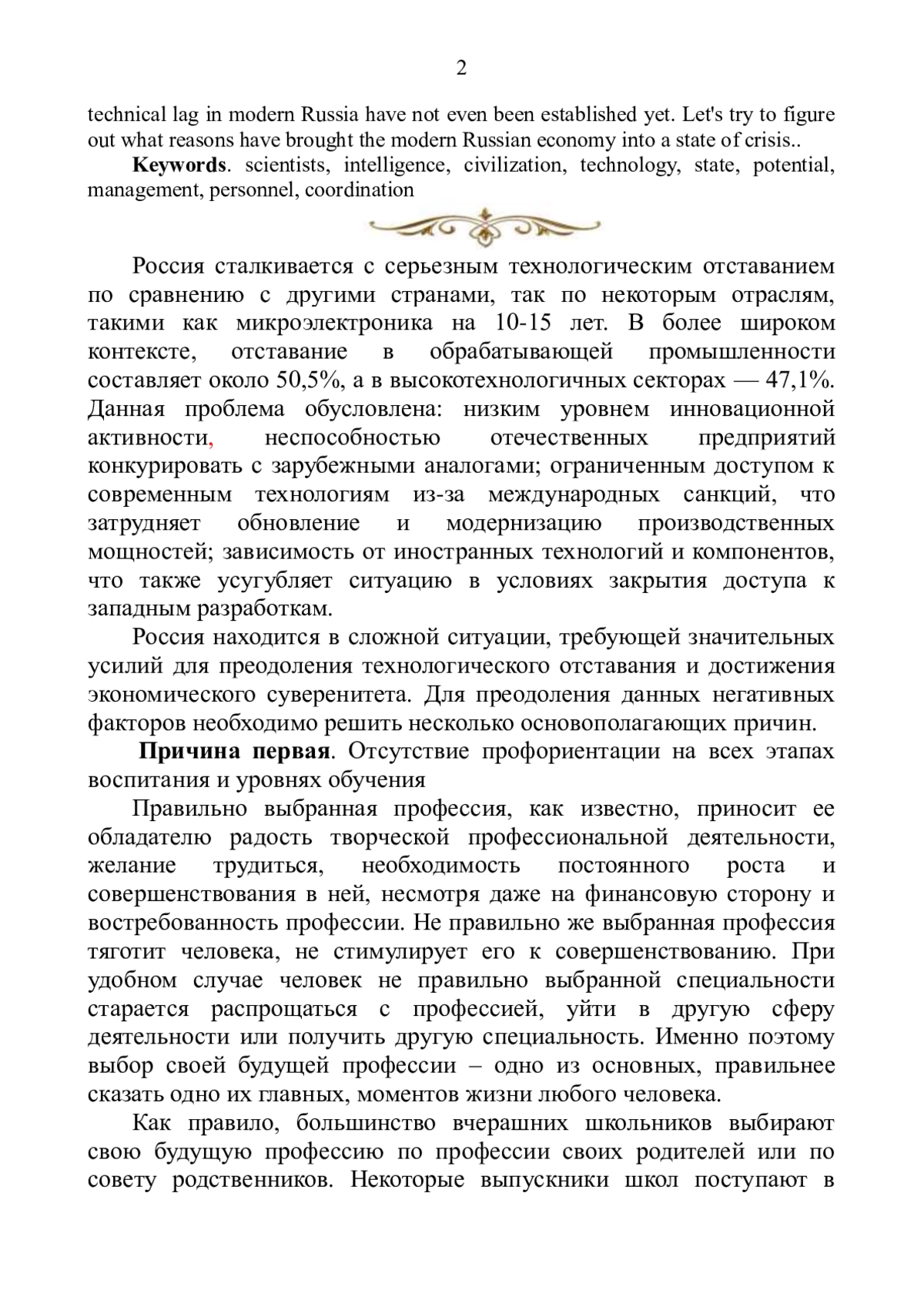 В начале 21 века Россия оказалась в состоянии глубокого промышленного кризиса, результатом чего явилось значительное научно - техническое отставание от развитых мировых держав. Такое состояние России очень беспокоит первых лиц нашего государства, которые еще 10 лет назад провозгласили курс на преодоление промышленной отсталости страны. Однако дальше разговоров, общих деклараций и пожеланий пока дело не идет. К сожалению, реализовать провозглашенный высшим руководством страны курс в настоящее время весьма не просто, поскольку до сих пор даже не установлены причины научно - технического отставания современной России. Попробуем разобраться, какие причины привели современную российскую экономику в кризисное состояние.