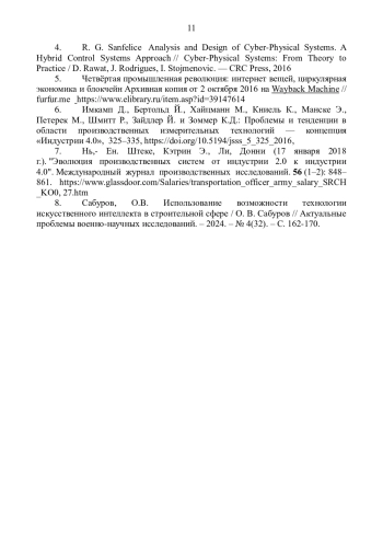 8. Сабуров, О.В. Использование возможности технологии искусственного интеллекта в строительной сфере / О.В. Сабуров // Актуальные проблемы военно - научных исследований. - 2024. - № 4(32). - С. 162-170. EDN: LLOCDL