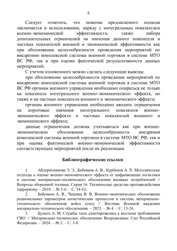 2. Бабенков А. В., Чешина В. В. Военно - экономическое обоснование рациональных параметров логистических процессов в системе материально - технического обеспечения войск (сил) // Вестник Военной академии материально - технического обеспечения. - 2023. - № 4. - С. 13-24. EDN: JOJISQ