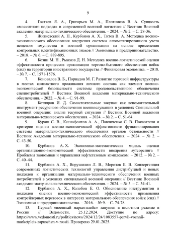 3. Булыга А. М. Службы тыла адаптировались к жестким требованиям “СВО” // Материально - техническое обеспечение Вооруженных Сил Российской Федерации. - 2024. - № 2. - С. 3-8. EDN: BMYIRB