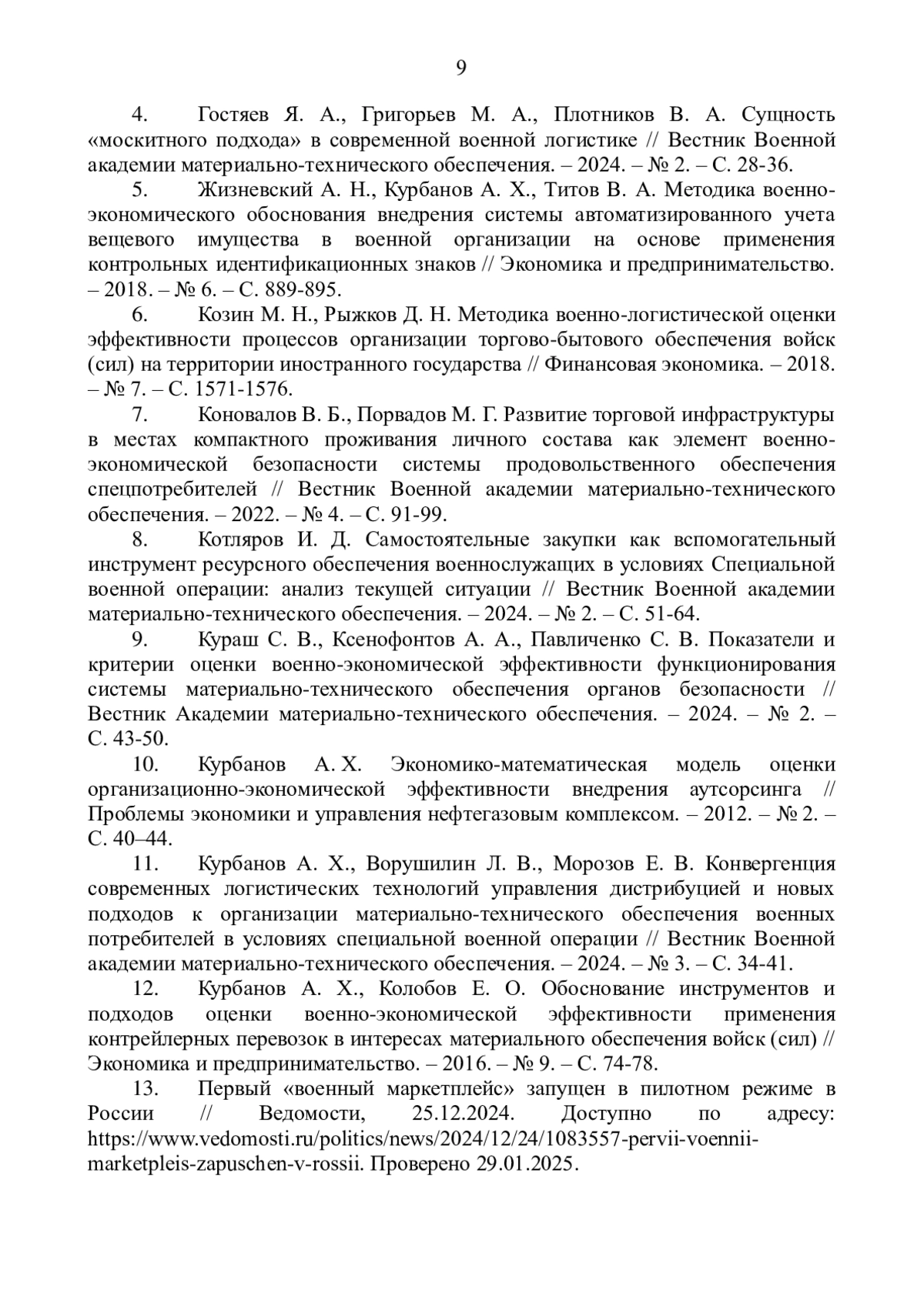9. Кураш С. В., Ксенофонтов А. А., Павличенко С. В. Показатели и критерии оценки военно - экономической эффективности функционирования системы материально - технического обеспечения органов безопасности // Вестник Академии материально - технического обеспечения. - 2024. - № 2. - С. 43-50. EDN: BDOQLM