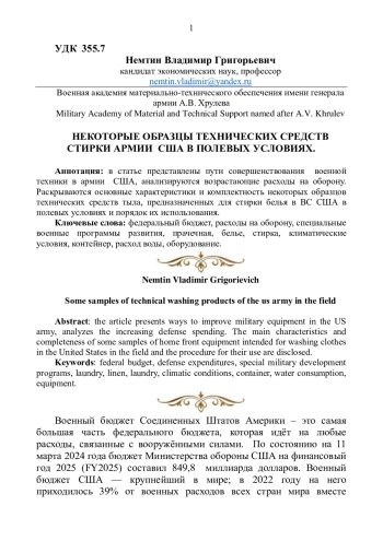 В статье представлены пути совершенствования военной техники в армии США, анализируются возрастающие расходы на оборону. Раскрываются основные характеристики и комплектность некоторых образцов технических средств тыла, предназначенных для стирки белья в ВС США в полевых условиях и порядок их использования.