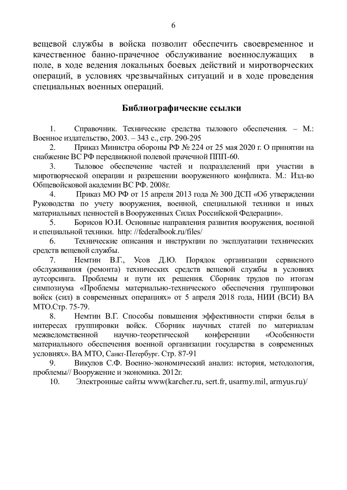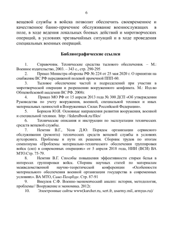 8. Немтин В.Г. Способы повышения эффективности стирки белья в интересах группировки войск. Сборник научных статей по материалам межведомственной научно - теоретической конференции “Особенности материального обеспечения военной организации государства в современных условиях” - Санкт-Петербург. Стр. 87-91.