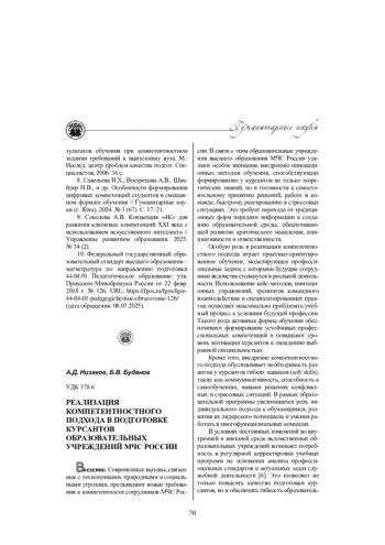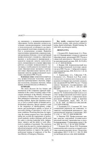 4. Карапузиков А.А., Опарин Д.Е., Могилевская Т.Е. Компетентностный подход в системе профессиональной подготовки курсантов вузов МЧС России // Современная наука: актуальные проблемы теории и практики. Серия: Гуманитарные науки. 2025. № 6-2. С. 82-85. DOI: 10.37882/2223-2982.2025.06-2.19