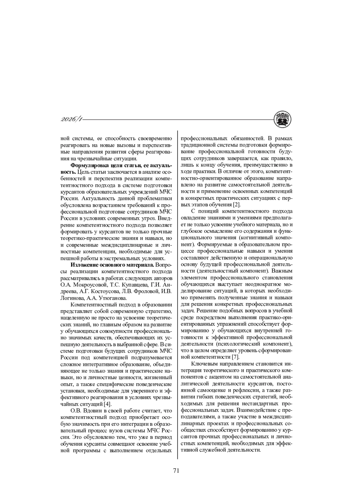 2. Вдовин О.В. Компетентностный подход в профессиональной подготовке курсантов вуза МЧС России // Сибирский пожарно-спасательный вестник. 2018. № 4(11). С. 42-44.