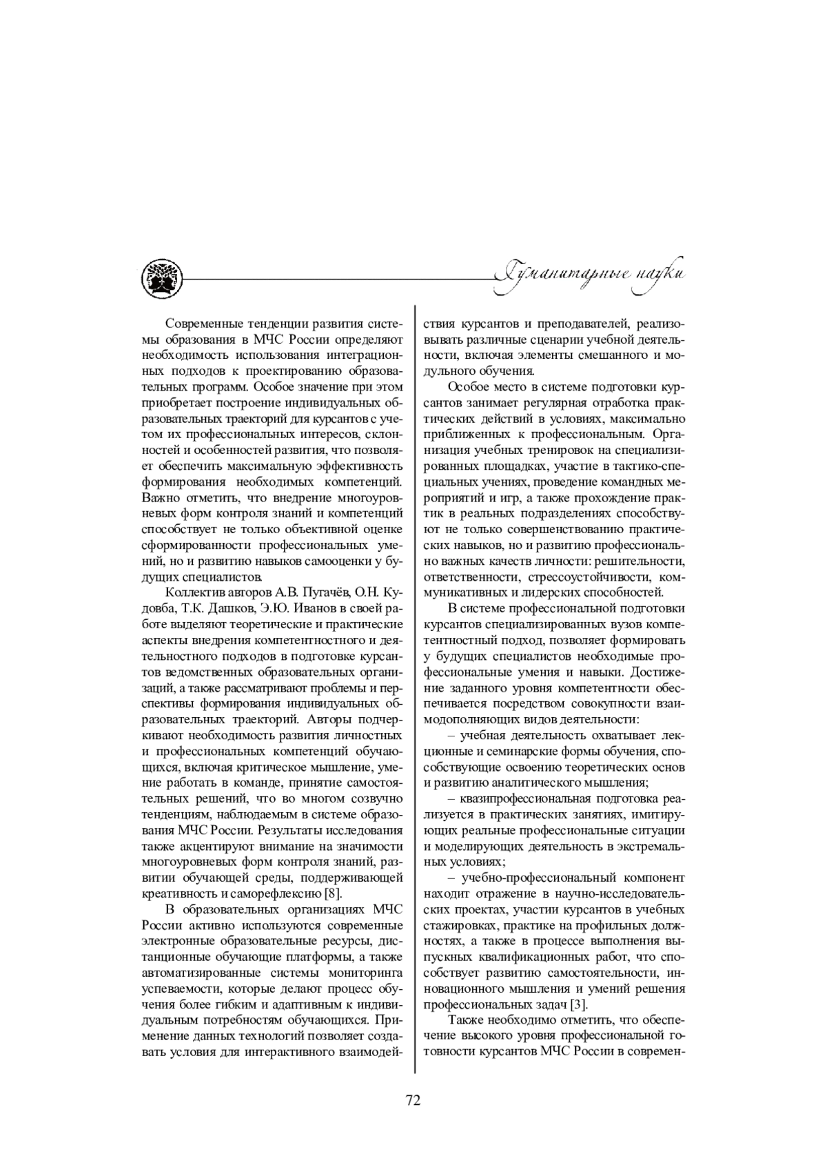 8. Пугачев А.В., Кудовба О.Н., Дашков Т.К., Иванов Э.Ю. Современная образовательная парадигма: компетентностный и деятельностный подход в подготовке курсантов и слушателей вузов МВД России // Human Progress. 2025. Т. 11, № 3. DOI: 10.46320/2073-4506-2025-3a-28