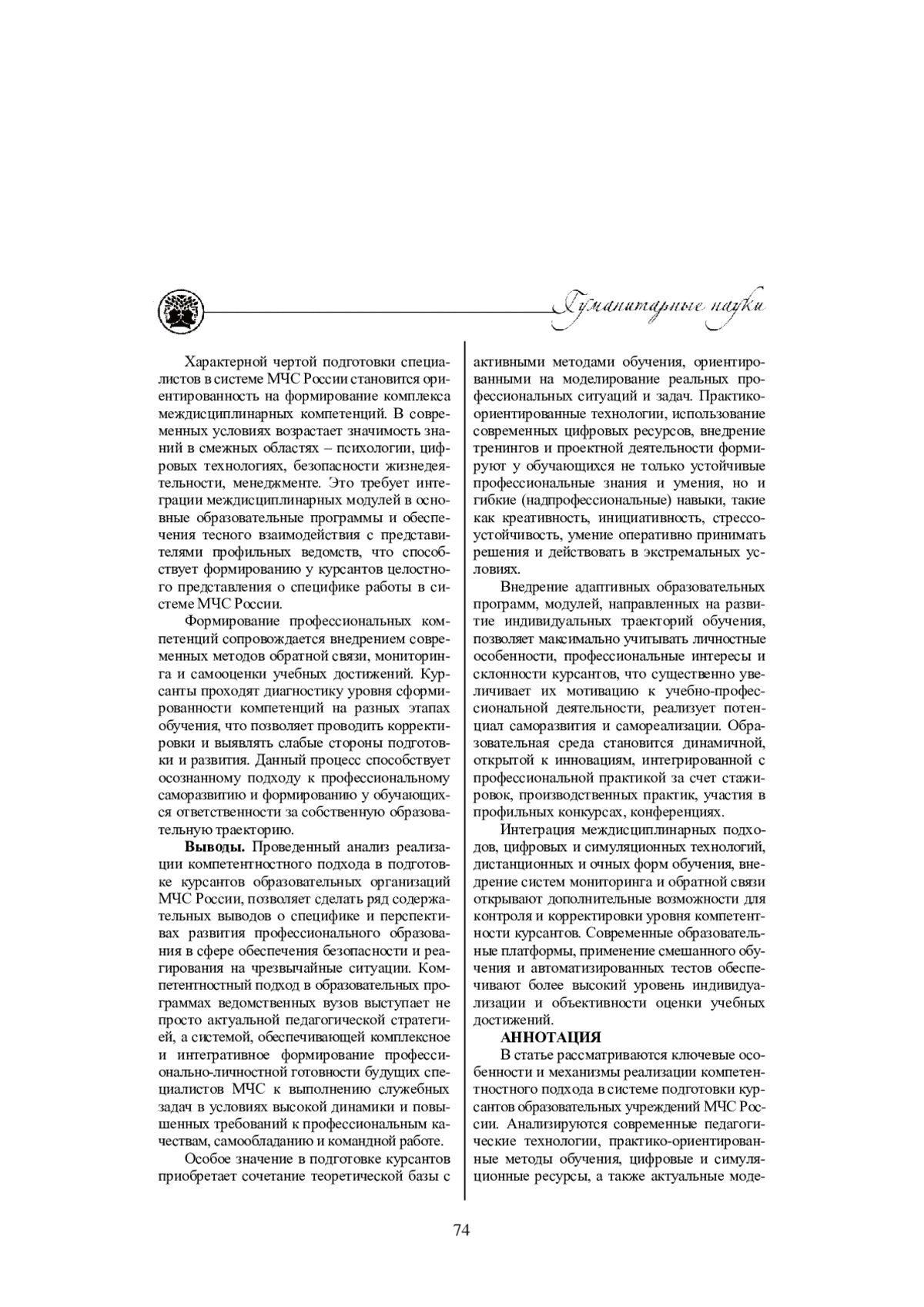 В статье рассматриваются ключевые особенности и механизмы реализации компетентностного подхода в системе подготовки курсантов образовательных учреждений МЧС России. Анализируются современные педагогические технологии, практико-ориентированные методы обучения, цифровые и симуляционные ресурсы, а также актуальные модели смешанного и индивидуализированного образования. Особое внимание уделяется интеграции междисциплинарных компетенций и психологической устойчивости как факторов успешной подготовки специалистов к работе в экстремальных условиях. Выявлены перспективные направления совершенствования программы обучения с учетом требований профессиональных стандартов, современных вызовов и необходимости формирования у курсантов лидерских качеств, самостоятельности, инициативности и умения эффективно работать в условиях неопределенности. Сделан вывод о необходимости постоянной адаптации образовательных программ и интеграции новых образовательных практик для повышения качества профессиональной подготовки сотрудников МЧС России.