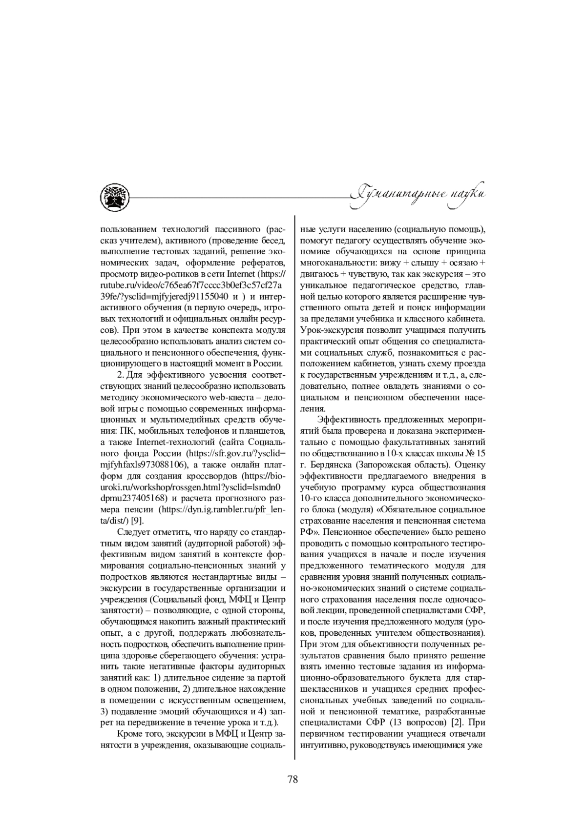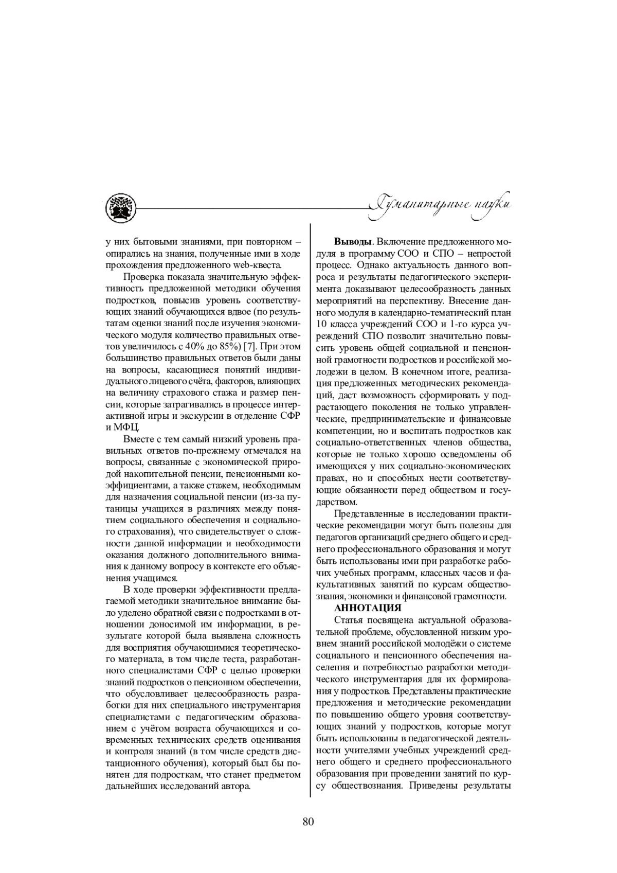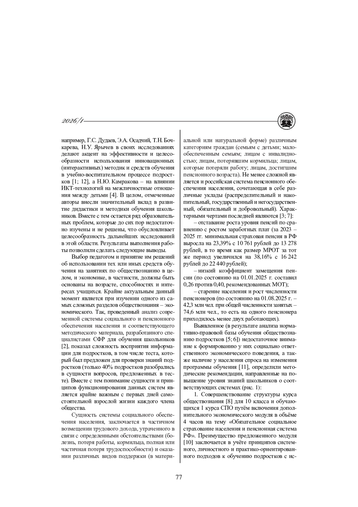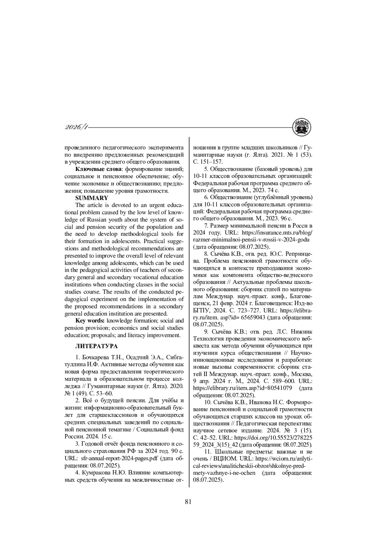 10. Сычёва К. В., Иванова Н. С. Формирование пенсионной и социальной грамотности обучающихся старших классов на уроках обществознания // Педагогическая перспектива: научное сетевое издание. 2024. № 3 (15). С. 42 - 52. DOI: 10.55523/27822559_2024_3(15)_42
