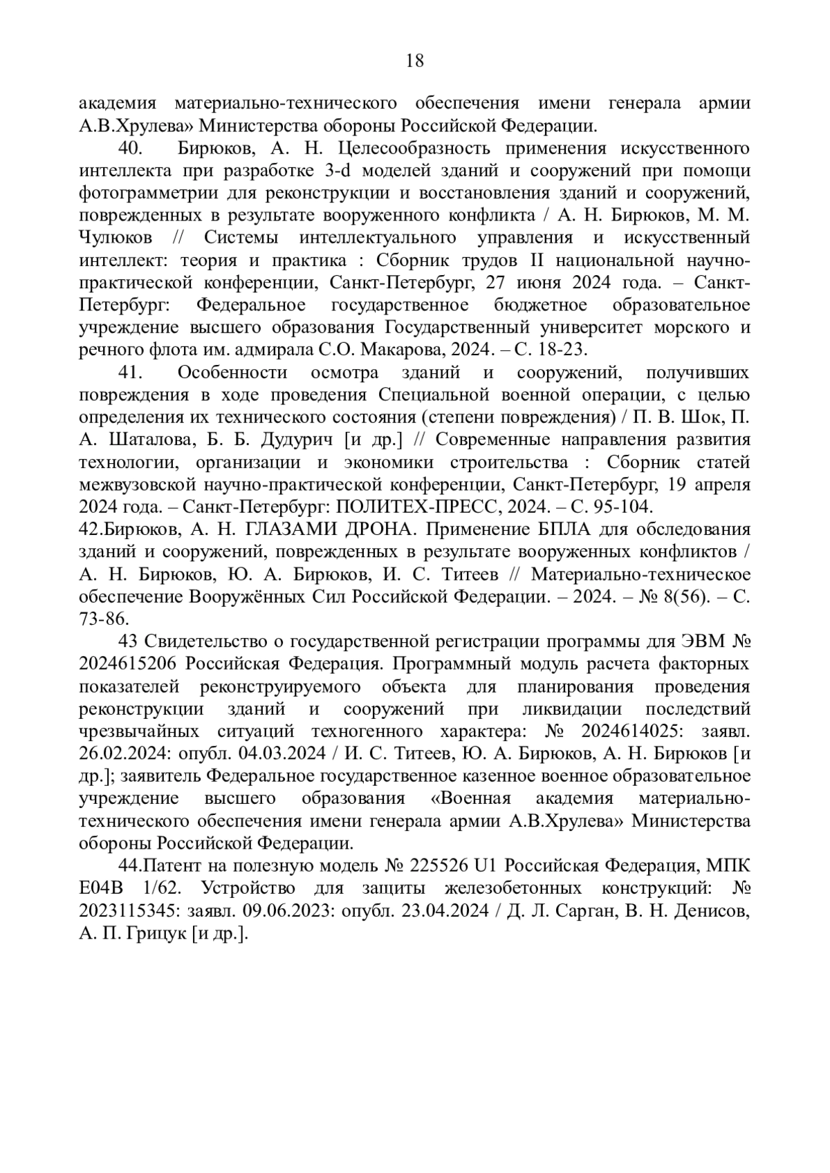 43. Свидетельство о государственной регистрации программы для “ЭВМ” № 2024615206 Российская Федерация. Программный модуль расчета факторных показателей реконструируемого объекта для планирования проведения реконструкции зданий и сооружений при ликвидации последствий чрезвычайных ситуаций техногенного характера: № 2024614025: заявл. 26.02.2024: опубл. 04.03.2024 / И.С. Титеев, Ю.А. Бирюков, А.Н. Бирюков [и др.].