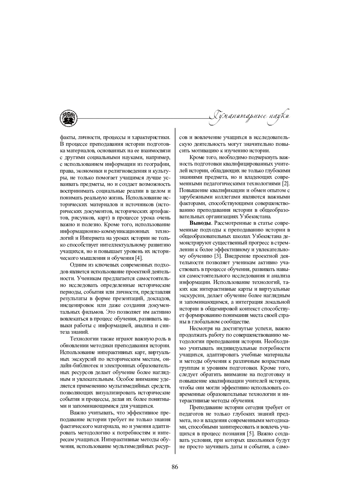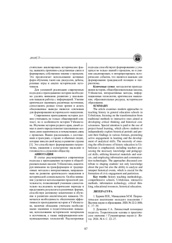 В статье рассматриваются современные подходы к преподаванию истории в общеобразовательных школах Узбекистана, акцентируя внимание на трансформации от традиционных методов к интерактивным, направленным на развитие критического мышления и исторической сознательности. Особое внимание уделяется использованию проектной деятельности, позволяющей ученикам самостоятельно исследовать исторические периоды и представлять результаты в различных формах, способствуя активному вовлечению в обучение и развитию аналитических навыков. Отмечается необходимость обеспечения эффективности преподавания истории в Узбекистане, включая обладание учителем необходимыми знаниями и педагогическими навыками, использование исторических материалов и источников, а также информационно-коммуникационных технологий. Рассмотренные подходы способствуют формированию у учащихся не только знаний о прошлом, но и умения анализировать и интерпретировать исторические события, что является важным для формирования гражданской позиции и патриотизма.