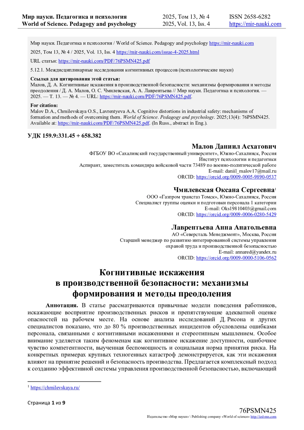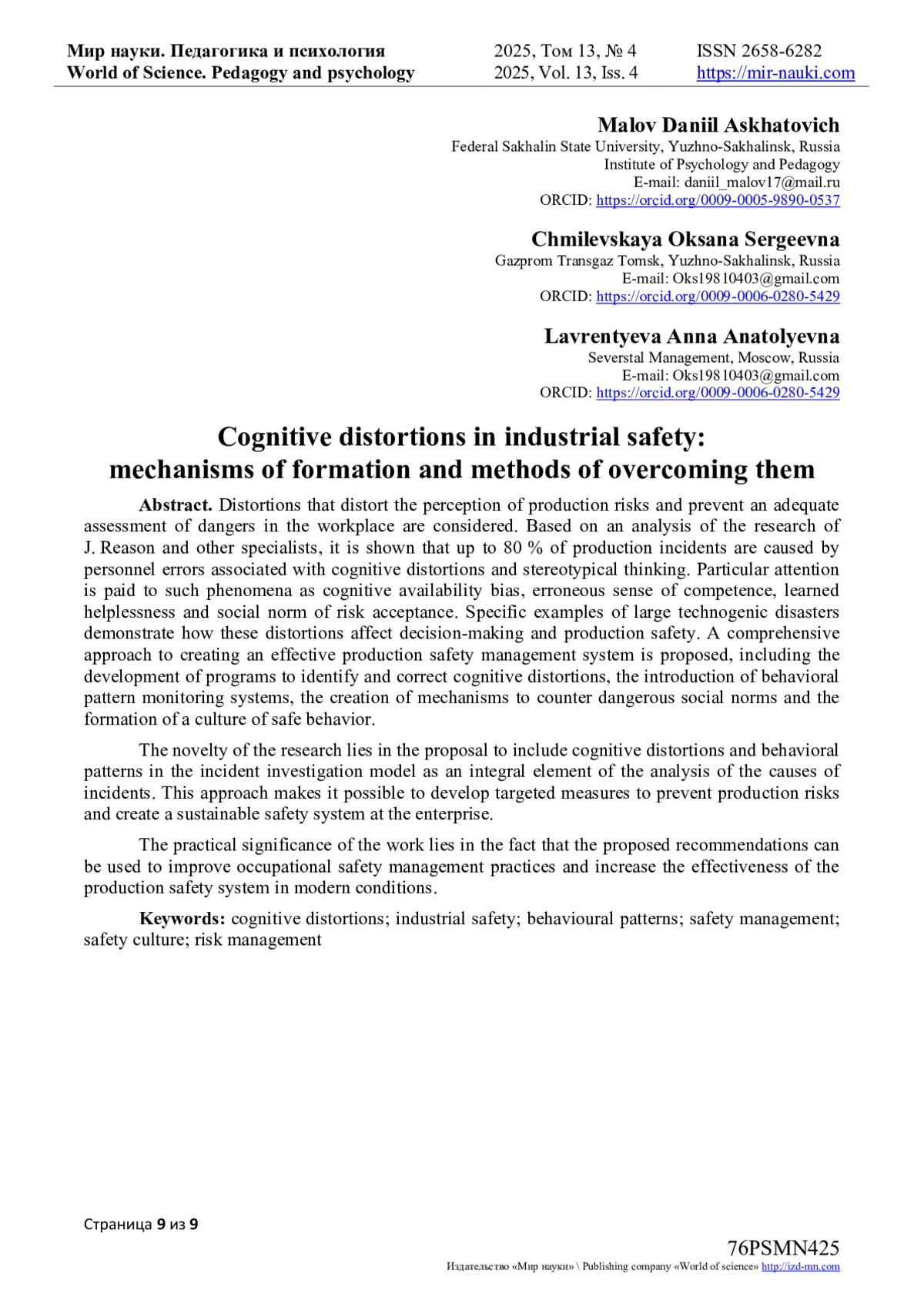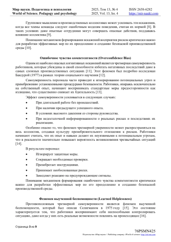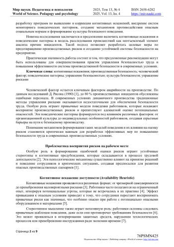 В статье рассматриваются привычные модели поведения работников, искажающие восприятие производственных рисков и препятствующие адекватной оценке опасностей на рабочем месте. На основе анализа исследований Д. Рисона и других специалистов показано, что до 80 % производственных инцидентов обусловлены ошибками персонала, связанными с когнитивными искажениями и стереотипным мышлением. Особое внимание уделяется таким феноменам как когнитивное искажение доступности, ошибочное чувство компетентности, выученная беспомощность и социальная норма принятия риска. На конкретных примерах крупных техногенных катастроф демонстрируется, как эти искажения влияют на принятие решений и безопасность производства. Предлагается комплексный подход к созданию эффективной системы управления производственной безопасностью, включающий разработку программ по выявлению и коррекции когнитивных искажений, внедрение систем мониторинга поведенческих паттернов, создание механизмов противодействия опасным социальным нормам и формирование культуры безопасного поведения.