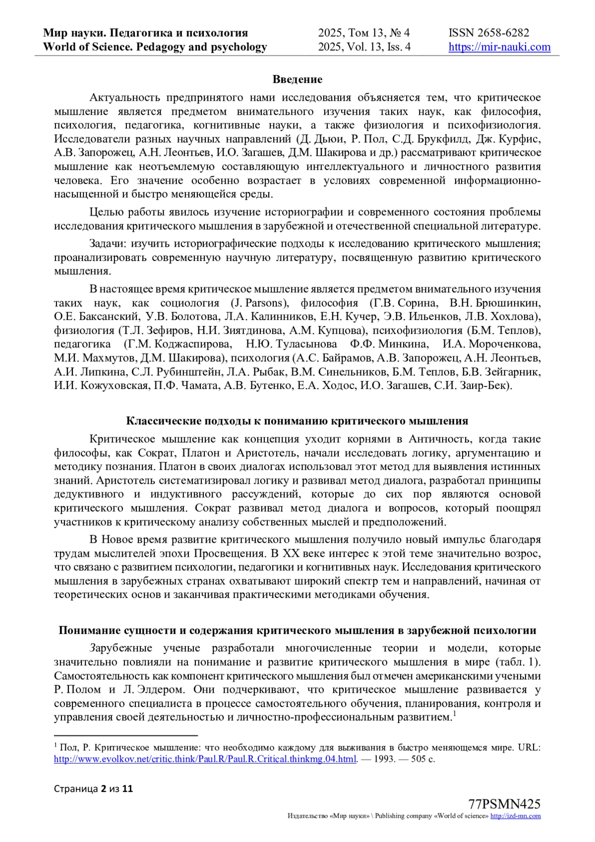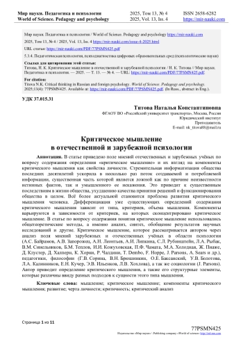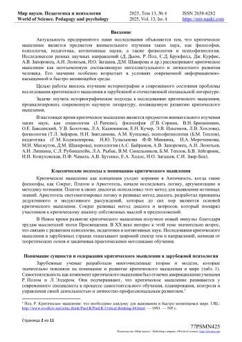Актуальность предпринятого нами исследования объясняется тем, что критическое мышление является предметом внимательного изучения таких наук, как философия, психология, педагогика, когнитивные науки, а также физиология и психофизиология.