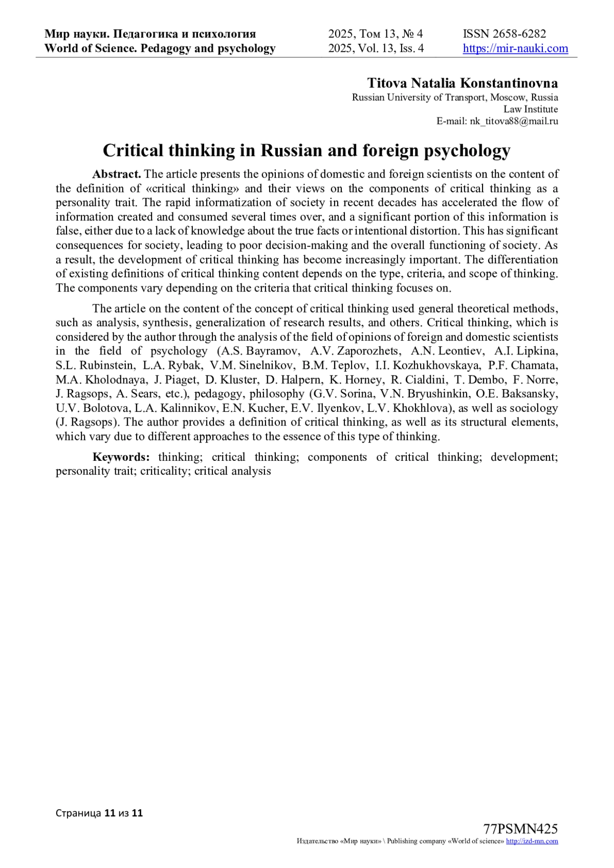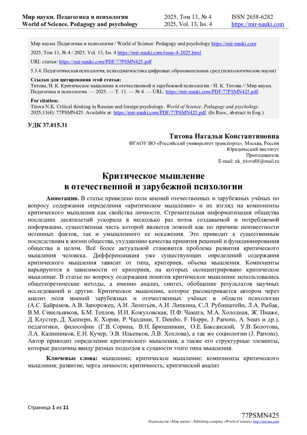 14. Корешникова Ю.Н. Организационные и педагогические условия формирования навыка критического мышления у студентов российских вузов / Ю.Н. Корешникова, И.Д. Фрумин, Т.В. Пащенко // Университетское управление: практика и анализ. - 2021. - С. 5-17. EDN: BGVLQH